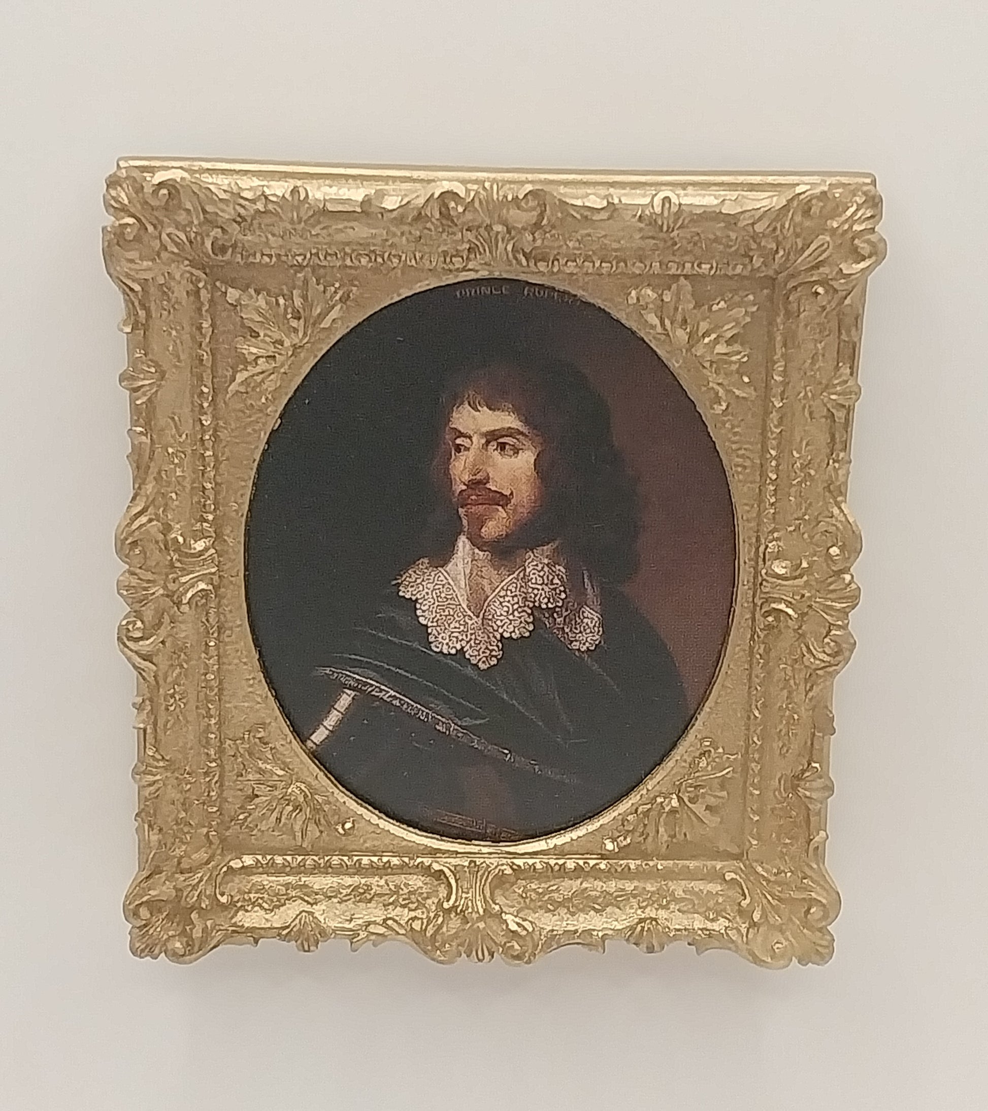 Gold Picture frame with oval insert, done by Artisan John Hodgson, with a print of Prince Rupert William Earl of Cravern, by Honthorst. Piece is signed by Artisan.