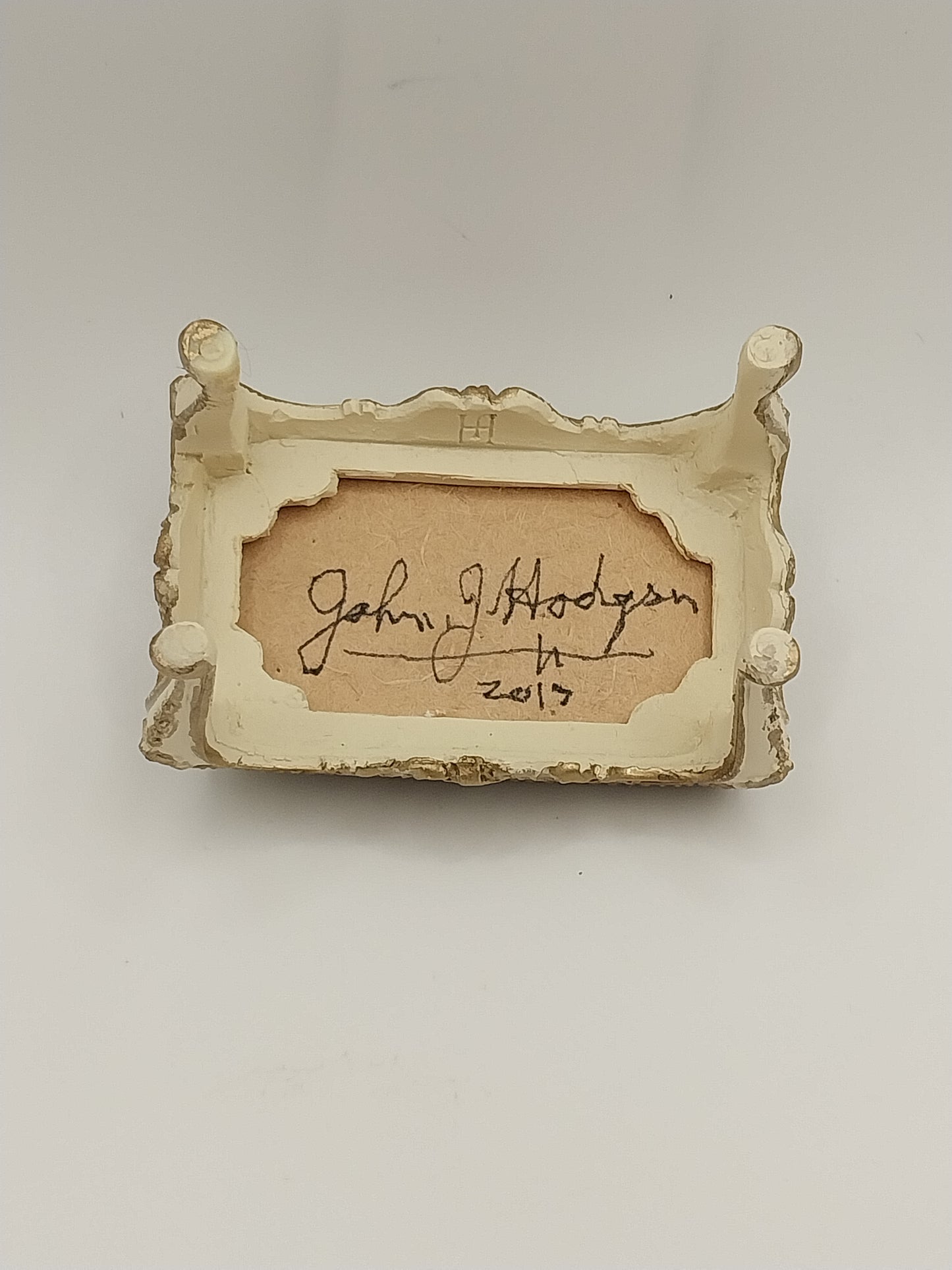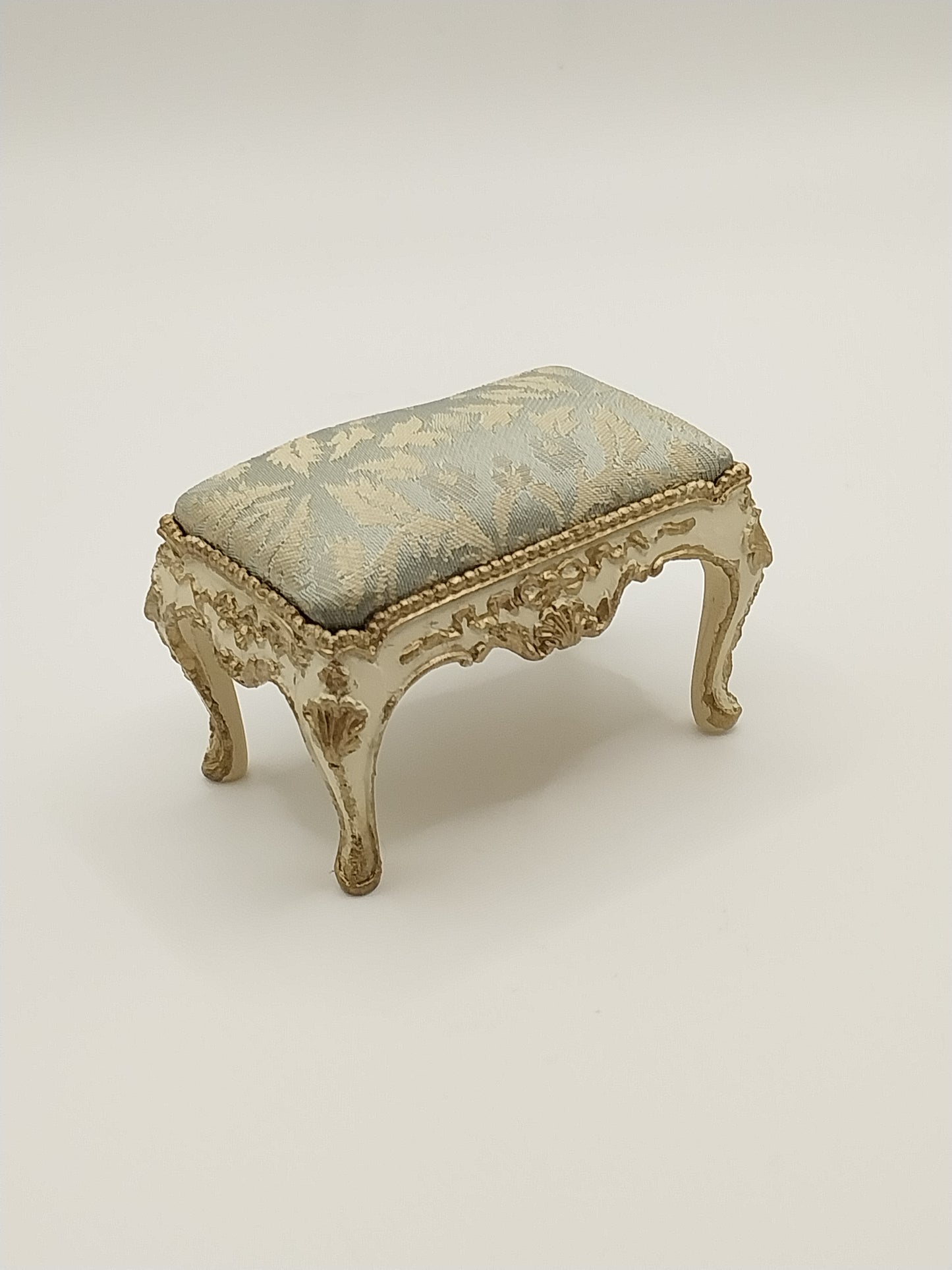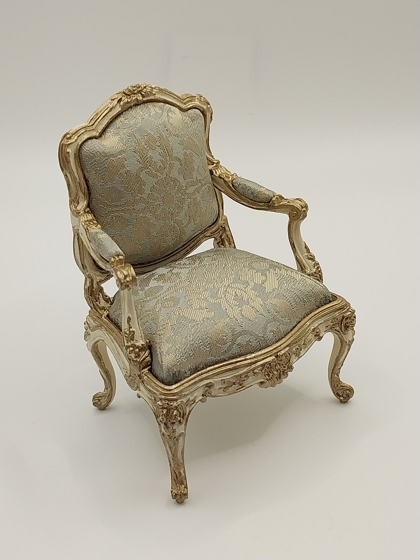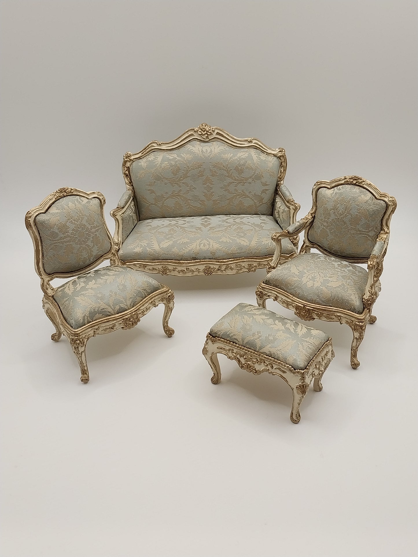 This Louis XV Settee Set includes a Settee, Arm Chair, Side Chair and Stool. Each piece is done by Artisan John Hodgson prior to 2022. Each piece is hand painted manila with 22kt gilt and has blue damask fabric. Each piece is signed by Artisan and the stool has actual signature of Artisan.