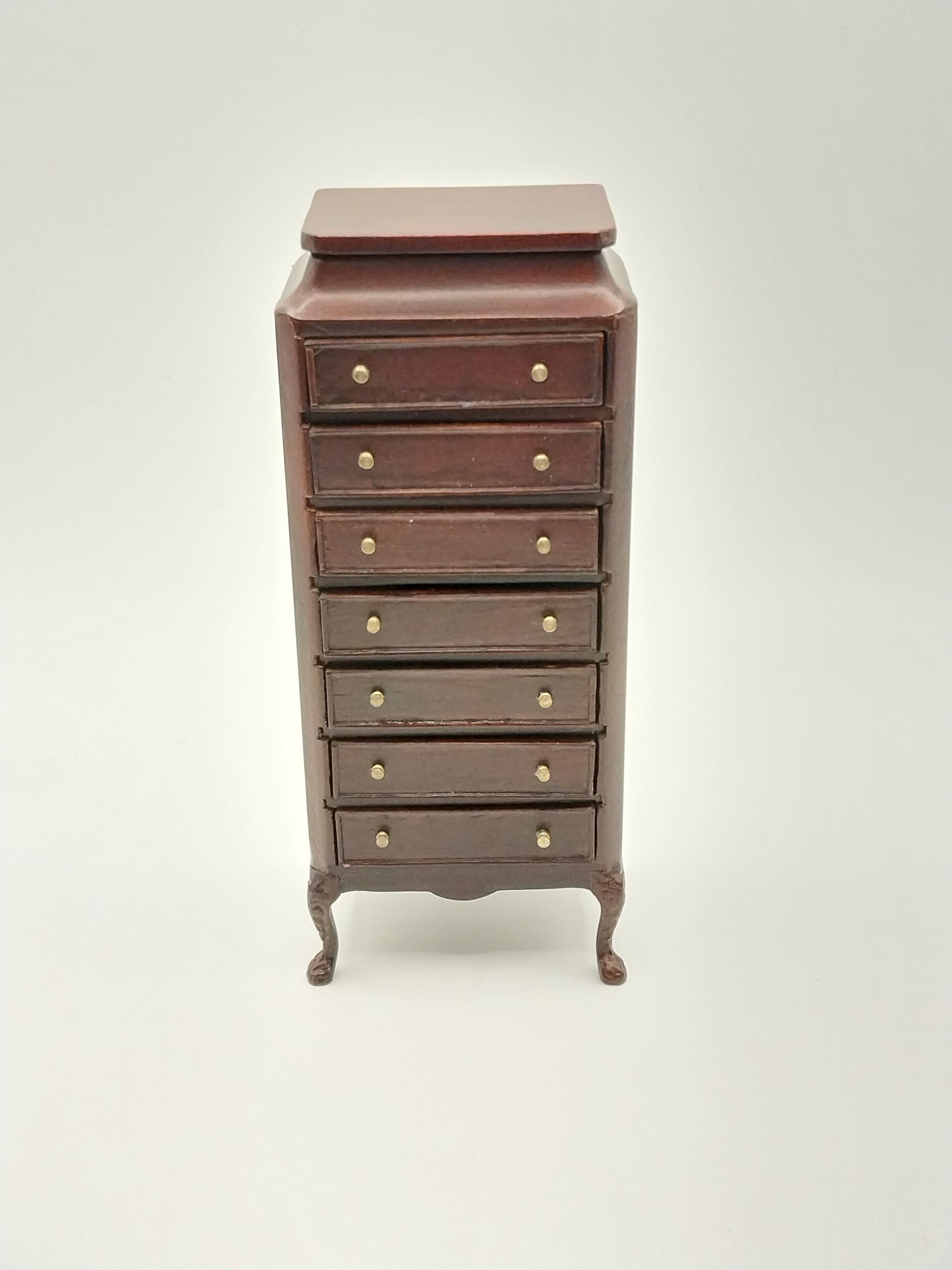 This Tall Jewelry Chest is made by Bespaq and comes in a Mahogany finish. Chest has hinged top that opens to jewelry holder and has 7 working drawers.