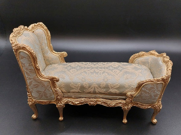 Louis XVI style, known as Transitional 1760-1775 chaise lounge or duchess. The original design was attributed to Jacques-Jean-Baptiste Tilliard, and the piece was housed in the Chateau de Versailles.