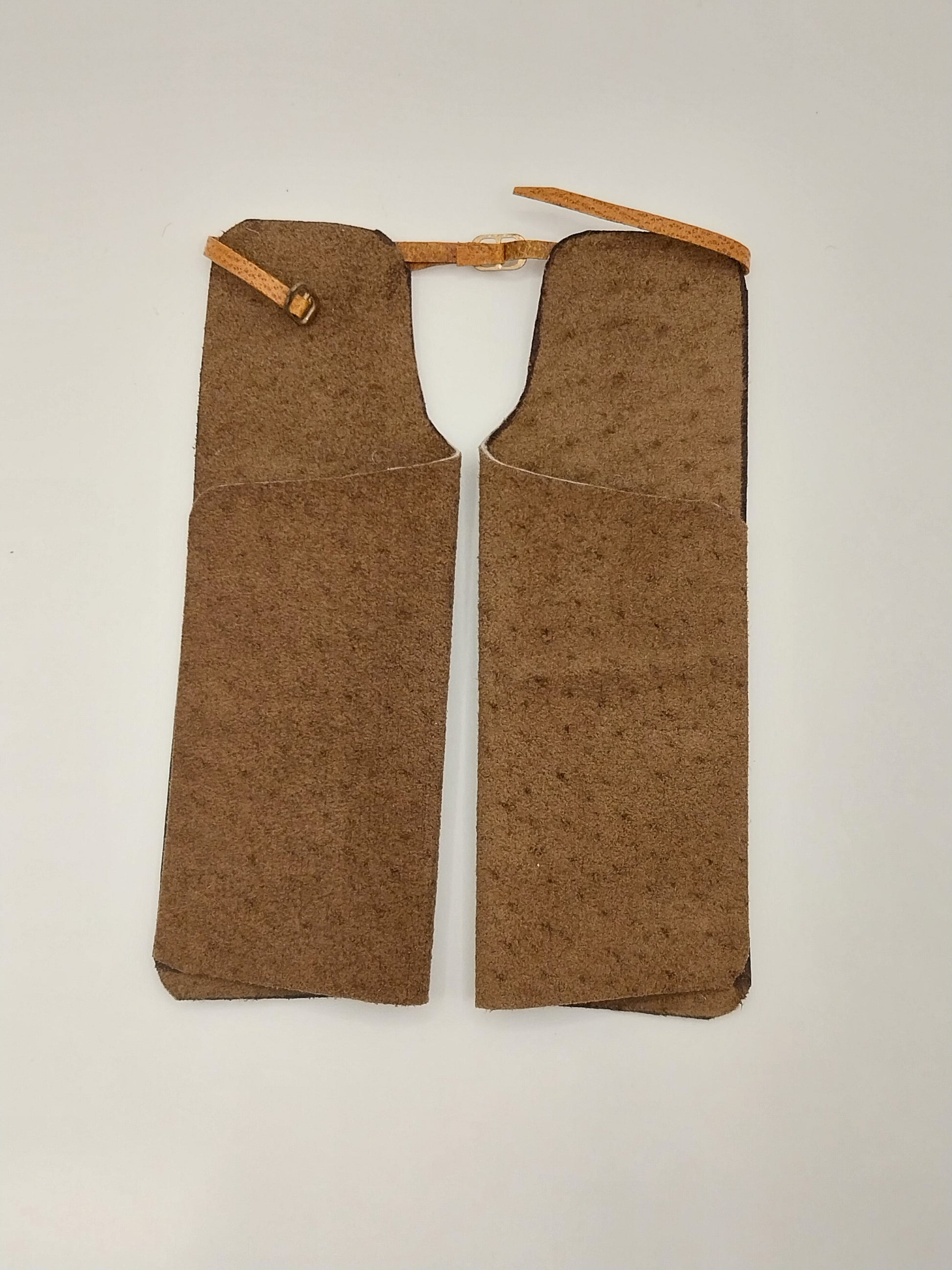 Old Chaps made of Brown Suede and Leather. Handmade by Prestige Leather. Shirley and George Petersen have been handcrafting miniatures for over 20 years. They have created their own patterns and use thin leather or suede, which they dye themselves and cut by hand, to create perfectly scaled items.