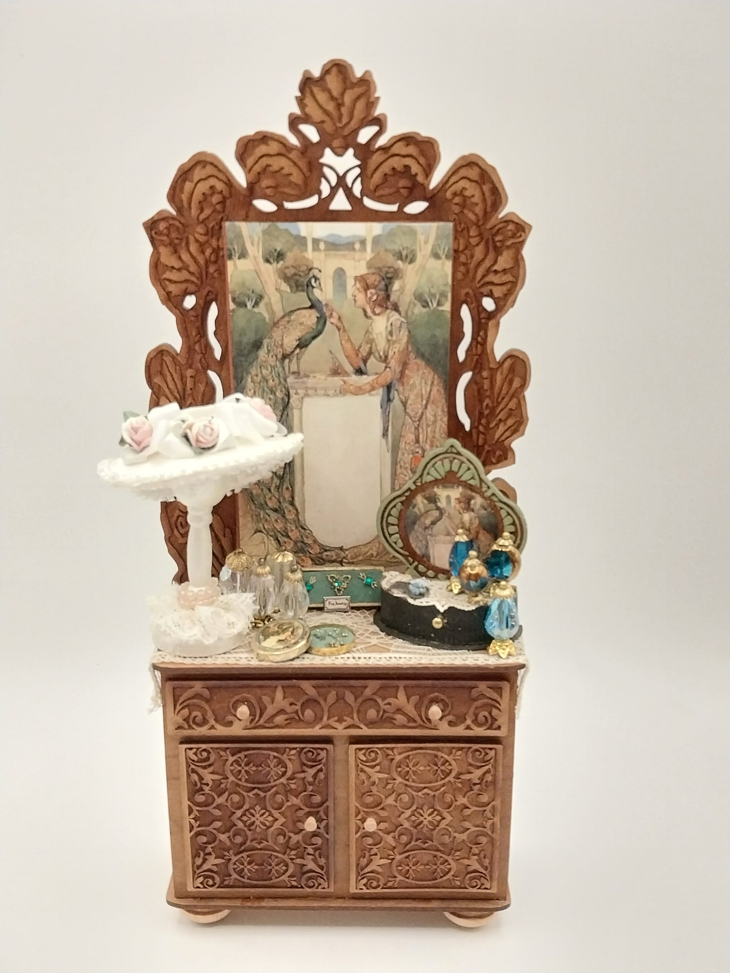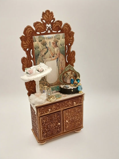 Etched Chest by Lisa Engler is decorated with Ladies Accessories by Loretta Kasza. Has Hat stand with White hat, perfume bottles, perfume display, and Jewelry. Cabinet doors and drawer do not open.