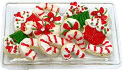 Set of a variety of Christmas Cookies in shape of Candy Canes and cupcake sweets on a Clear Glass Tray.