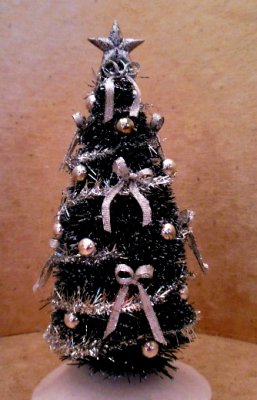 Christmas tree decorated with silver bows and silver balls, and a large Silver Star on the Top and a white felt tree skirt.
