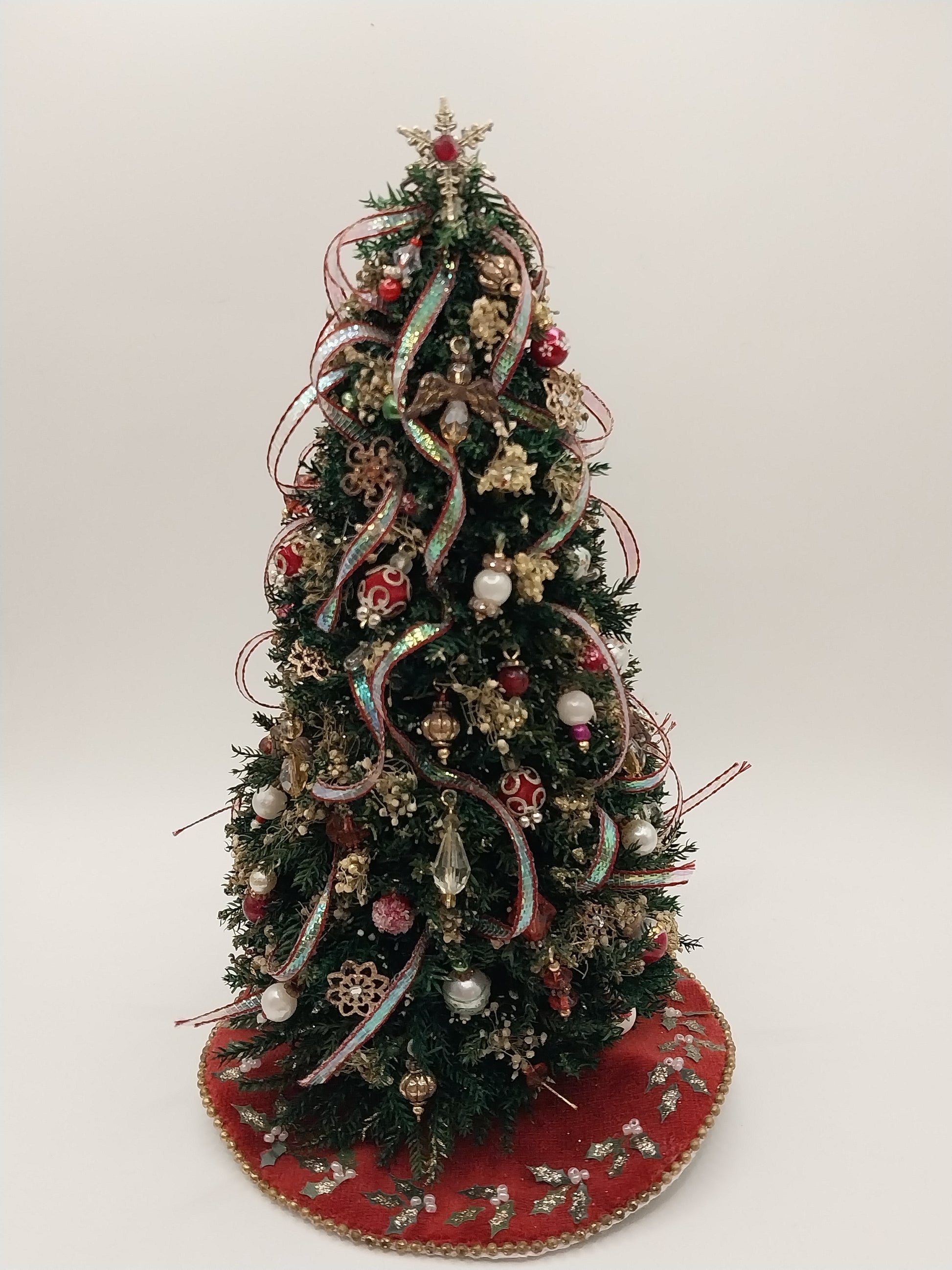 This Custom One of A Kind Christmas Tree with skirt was done by Artisan Maria Bevill. Tree has star topper and has a variety of red, whit, and pearl ornaments with red and green iridescent ribbon. Tree has white Christmas tree lights that work with a 12 Volt electrical system. Comes with red tree skirt with holly leaves.