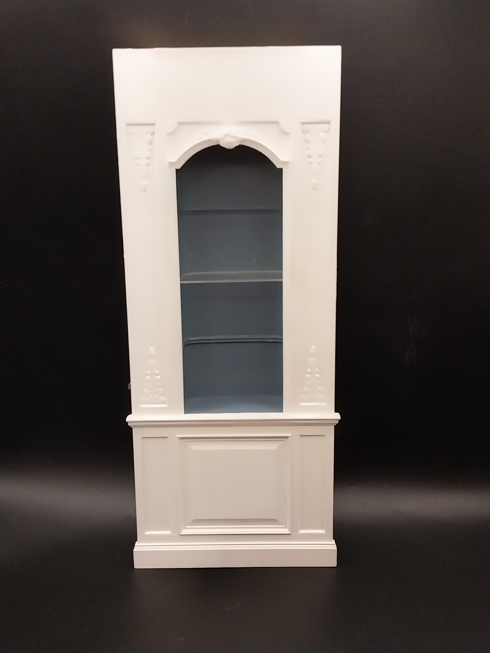 This White Corner Cabinet is made by Lawbre and has 3 clear acrylic shelves inside. Inside of cabinet is painted a Wedgewood blue. Cabinet has upper light that works with a 12 Volt electrical system to show light inside cabinet. Top of cabinet does have some scuff marks from installing and removing from house. Cabinet is sold as is. Was Originally $137.99 NOW ONLY $114.99.