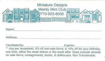 Join our Mainly Minis Discount Club!! Membership entitles you to 5% off everything in our store and/or on our website every time you shop! Includes quarterly "Miniature Digest" Newsletter, sent by email. Newsletter includes bonus buys, class and event schedule, tips, and more! All for $15 a year!
