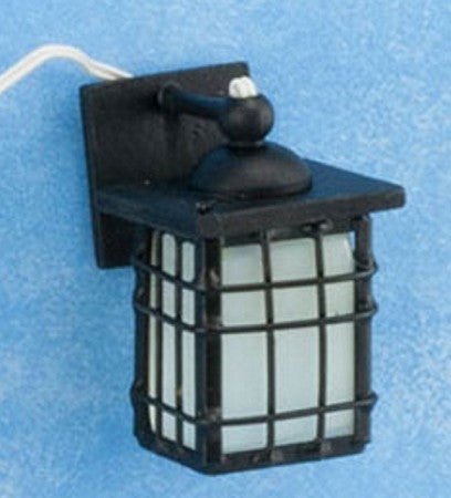 Black metal wall mounted coach lamp. Perfect for a craftsman-style home! Replaceable screw-in bulb, and works with a 12 Volt Electrical System