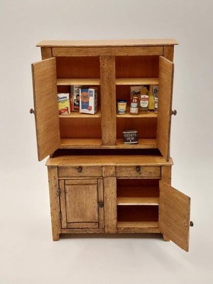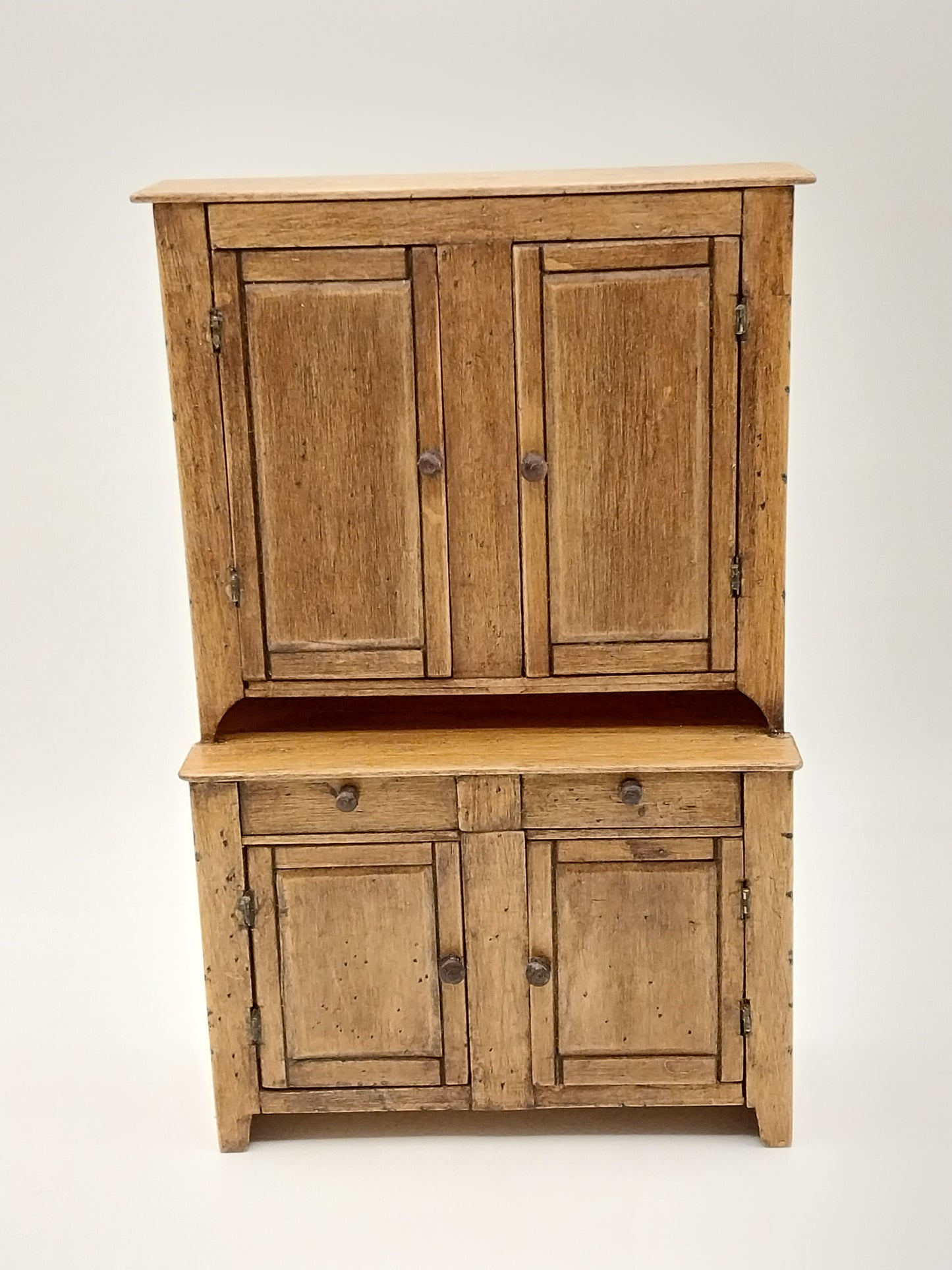 This Country Kitchen Dresser Hutch is stained and handmade by Artisan Ken Byers. Has 2 upper cabinet doors that open up to shelves which are halfway filled. Has lower working drawers and lower cabinet doors. Piece is signed by Artisan.