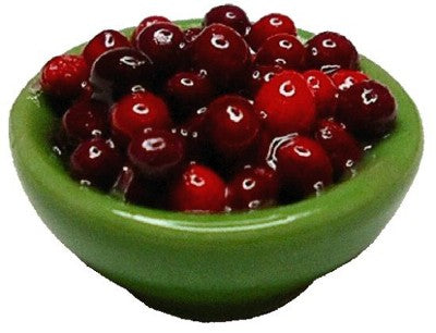 Green ceramic bowl contains lush red berries - could be cherries or cranberries!