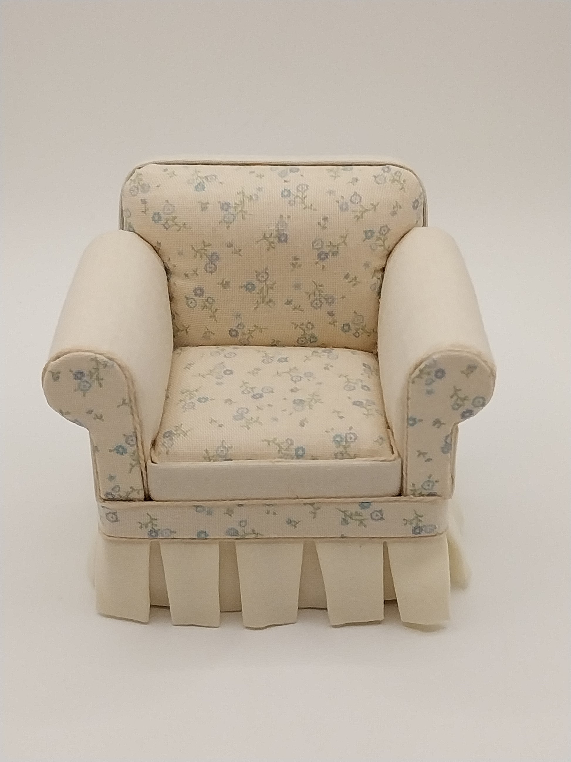 This is our elegant "shabby chic" style chair with a square back, rounded arms and softly pleated skirt in NEW FABRICS. We've coordinated a beautiful yellow & tiny blue floral fabric with a pale yellow fabric. The floral fabric has been used on the arm fronts, the seat cushion, seat back and the trim around the skirt. The chair comes with matching pillow and both the chair and pillow are beautifully finished in a coordinating pale yellow trim. The feet are wood. A matching sofa is available.