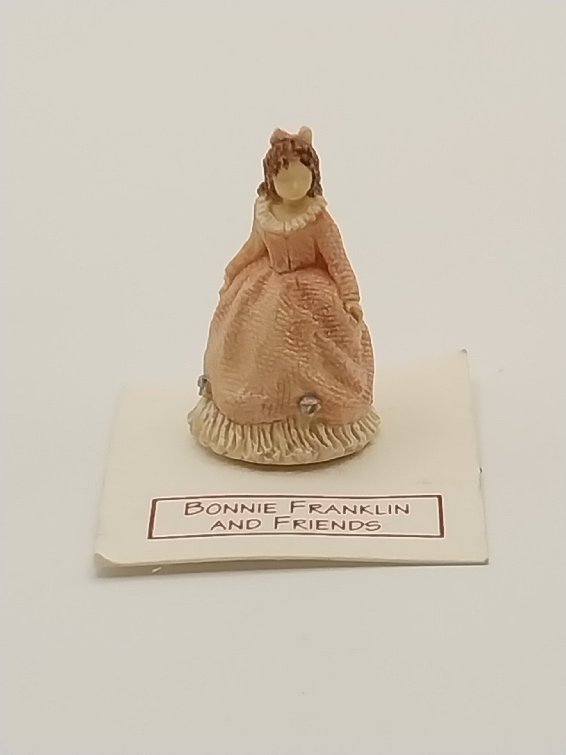 This Victorian Girl Figurine is made by Artisan Bonnie Franklin. She is wearing a pink dress and has long brown hair with pink bow.
