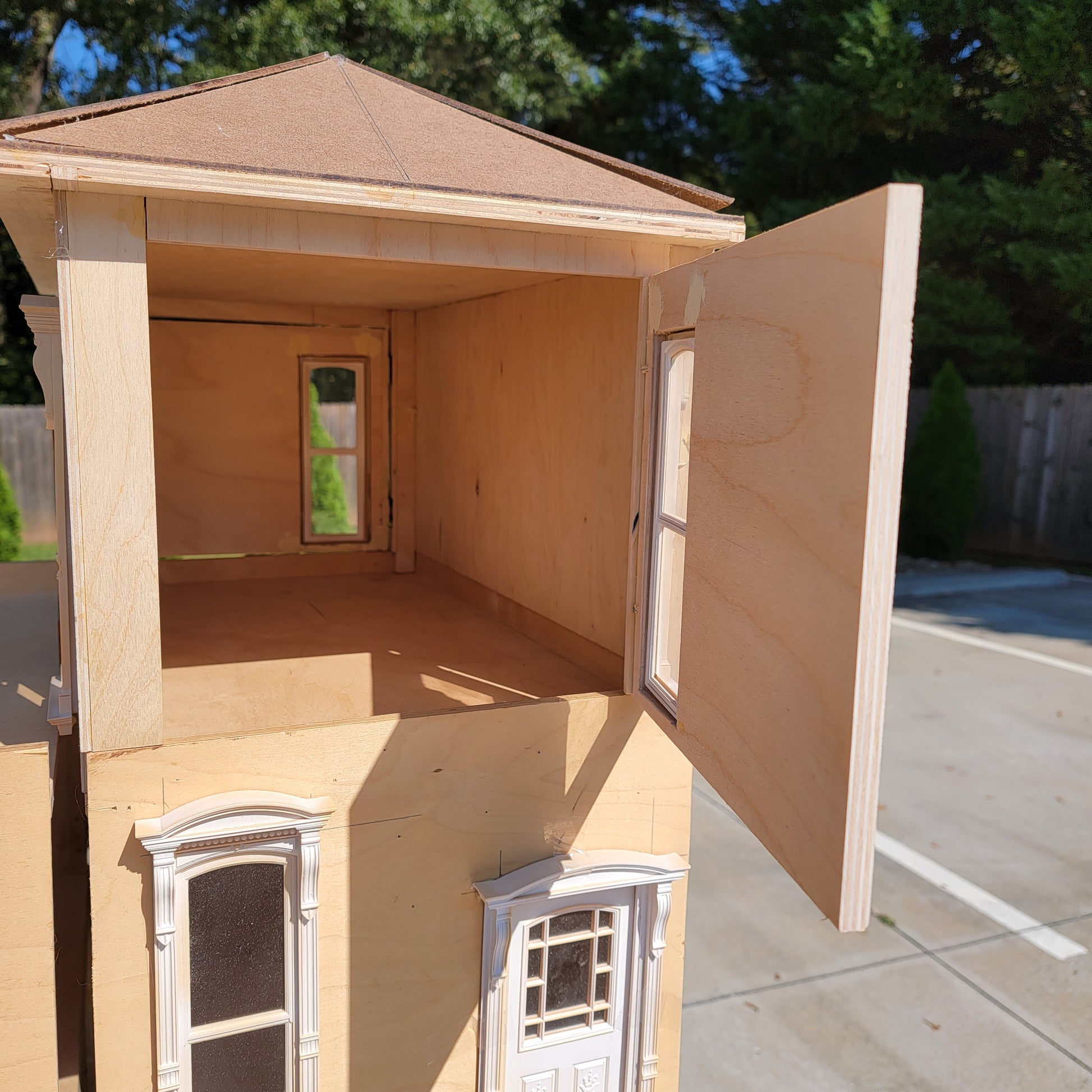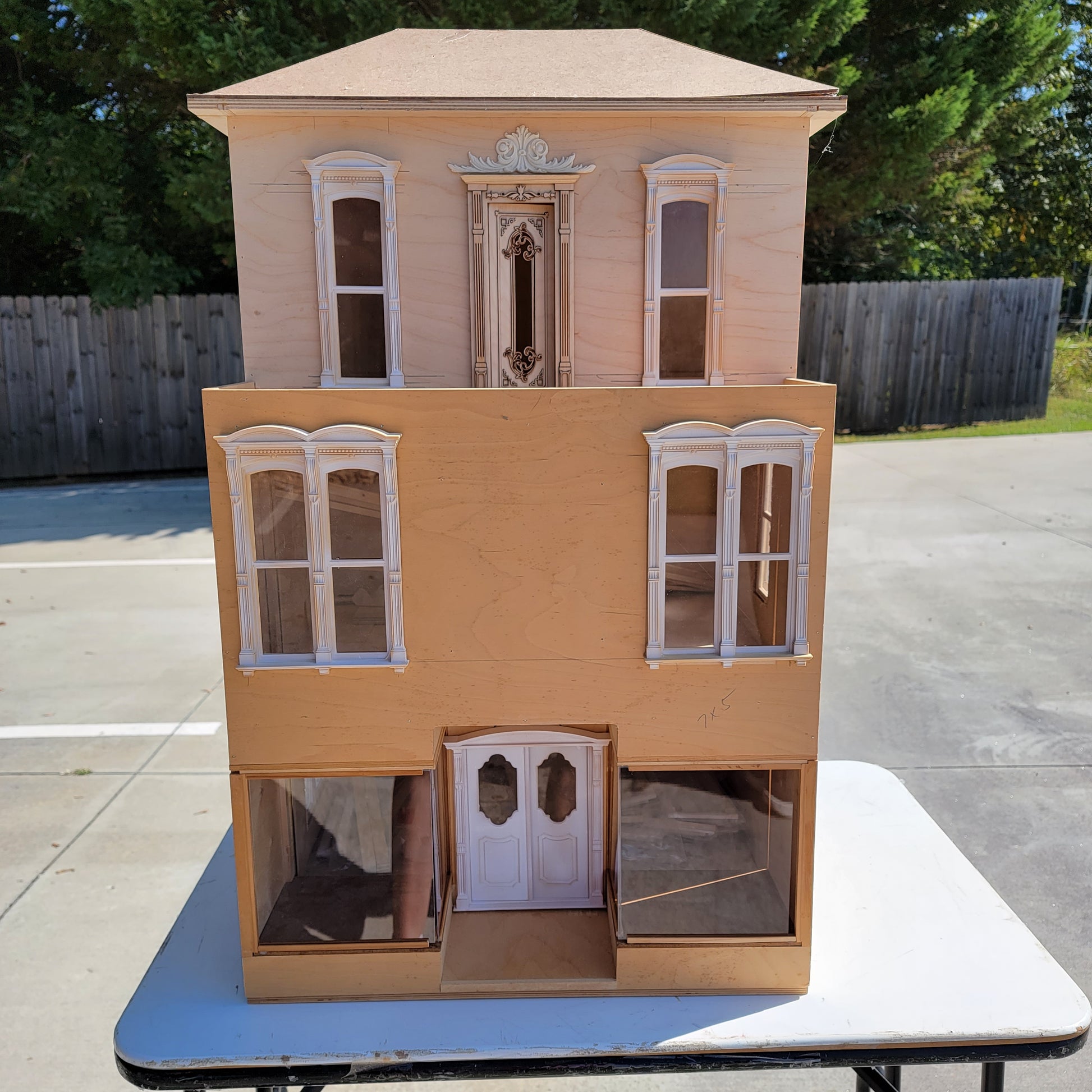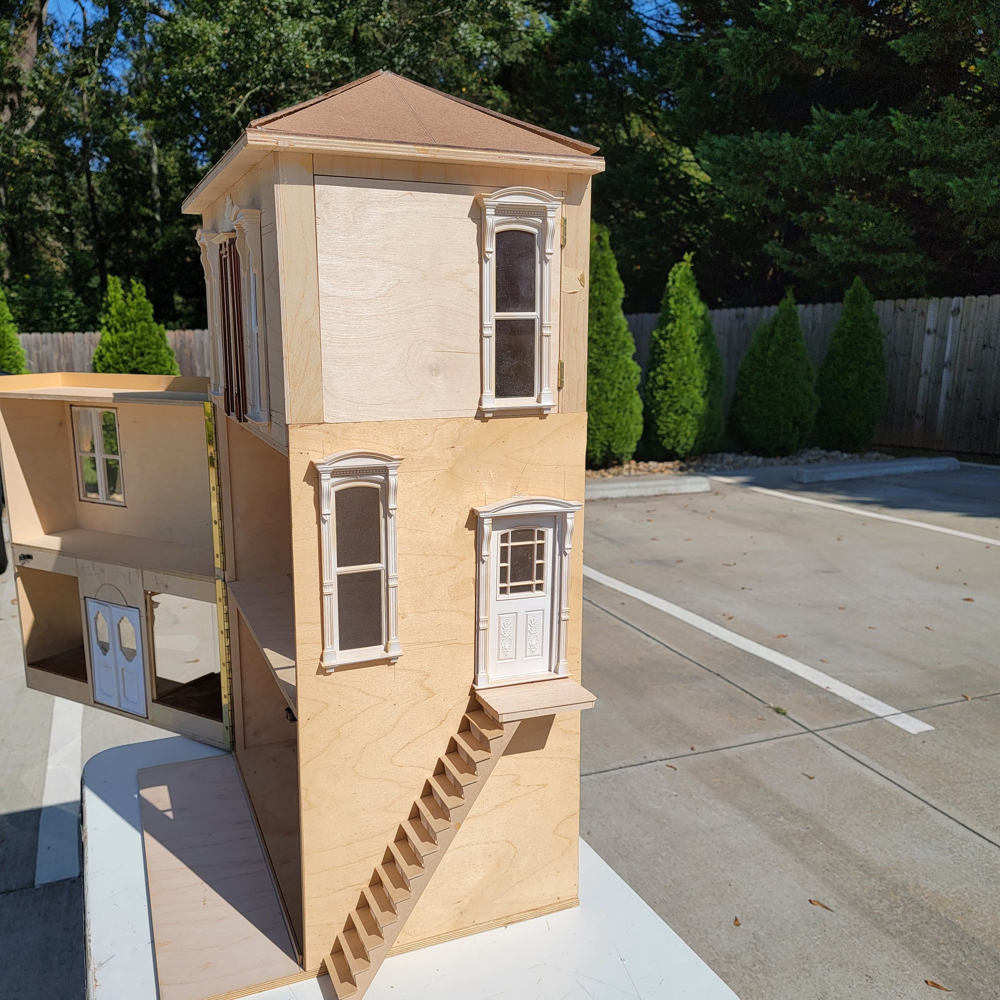 This is a one of a kind, custom shoppe. This was designed by the owner to finish and decorate a ladies shoppe. Ken Simon made the shop to her specs and design. This is very unique with the large square front windows from architect in later years. All components are made by Architectural Etc, known as Lawbre's Designer Line. This shoppe is made to be totally enclosed. It opens from the front and the sides. It also has stairs leading up to the living quarters and a third floor porch. It is a beautiful design for someone that has the vision and creative juices. You can also make it any shoppe that you desire. The shoppe is made of 3/8" thick birch and piano hinges were used for durability. All pieces included that are seen except for the table.