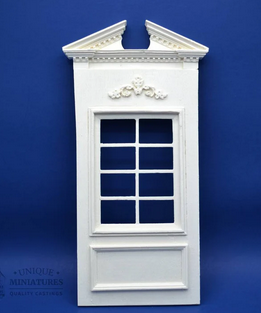Classical architectural detail for the modern dollhouse and miniature enthusiast! Ancient Greeks gave us the pediment, the triangular feature found atop doorways, windows, columns, porticos and dormers. This “broken pediment” is open at the apex and carries down to a large window pane. The full piece measures 4" wide x 8-3/4" tall.