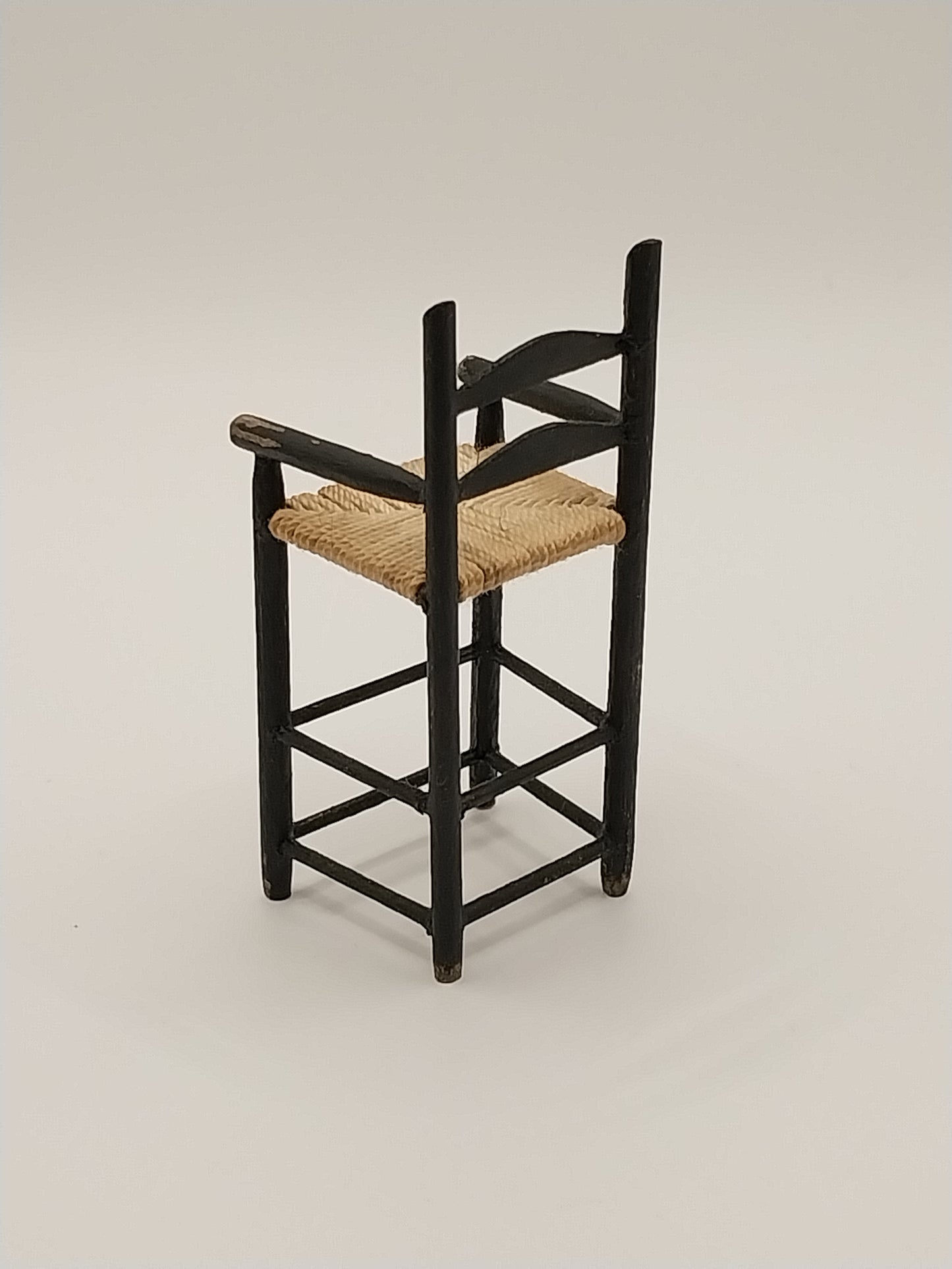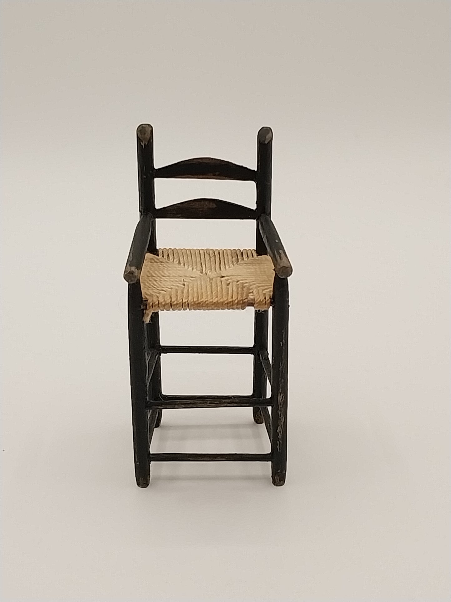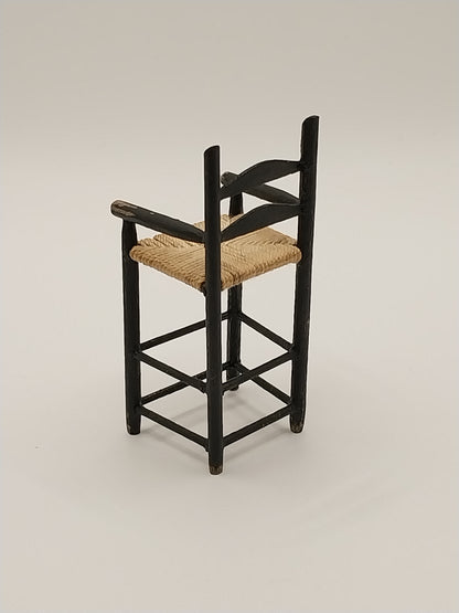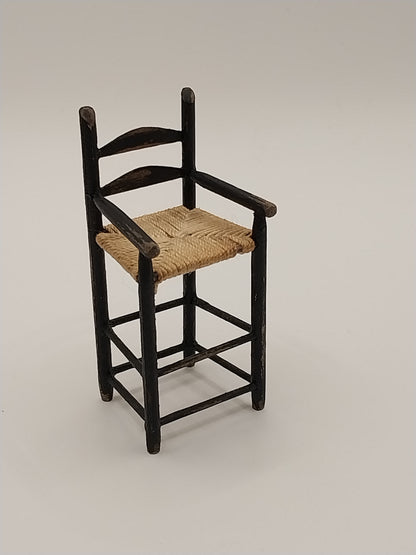 This Distressed Black Colonial Child's High Chair is made by Artisan Barbara Vajnar. Chair has rush seat.