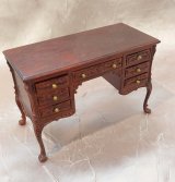 This Double Sided Desk is made by Bespaq and comes in a Mahogany finish. Desk has 6 side drawers and 1 large middle drawer on either side of desk. Desk has intricate embossed carved wood on each drawer and legs of desk. Comes with Desk Chair in Mahogany with burgundy faux leather.