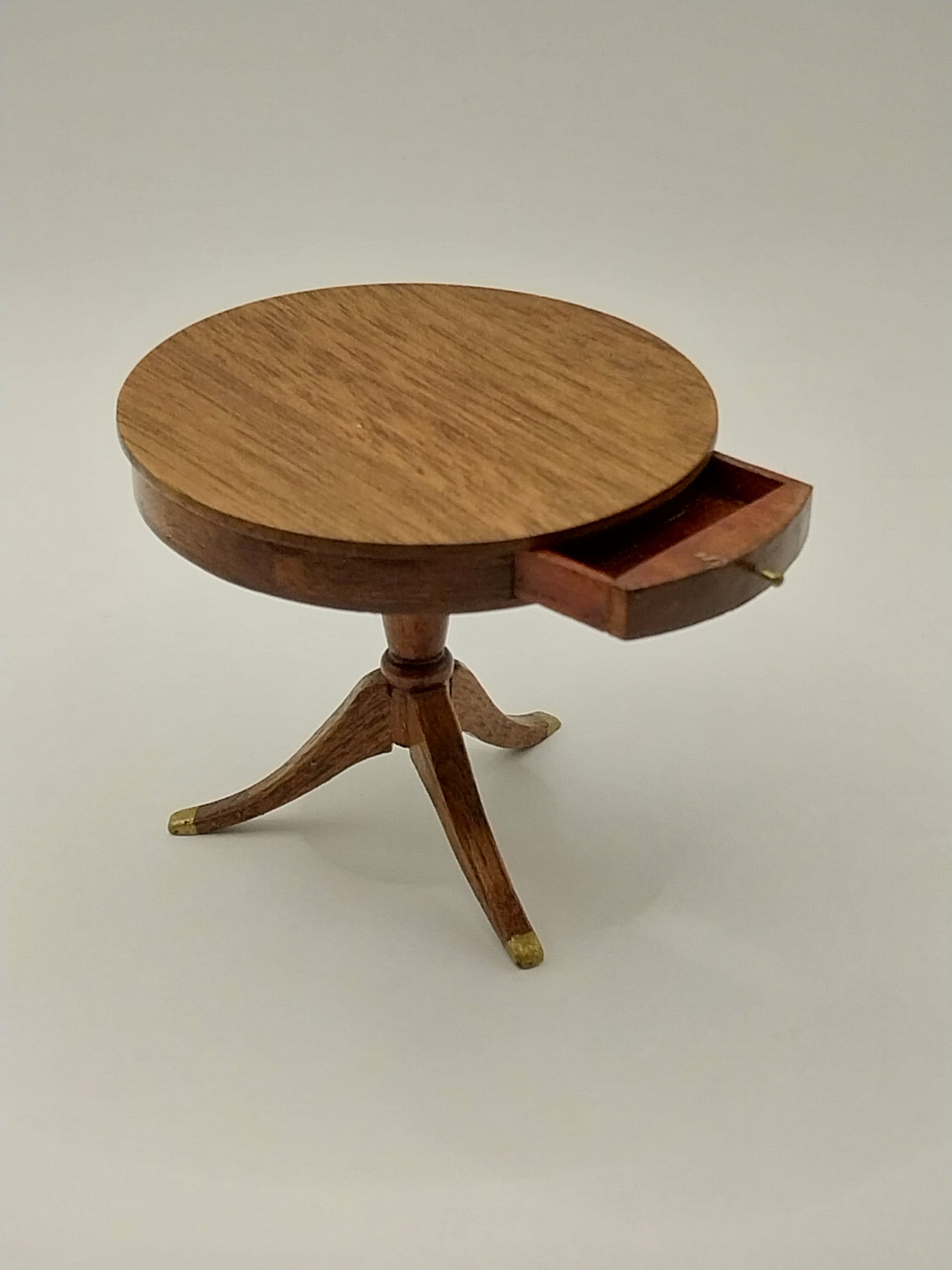 This Drum Table is made of Cherry Wood by Artisan Chestnut Hill Studio. Table has 2 working drawers on each side of table and a touch of gold on each foot of the 3 legs. Piece is signed by Artisan.