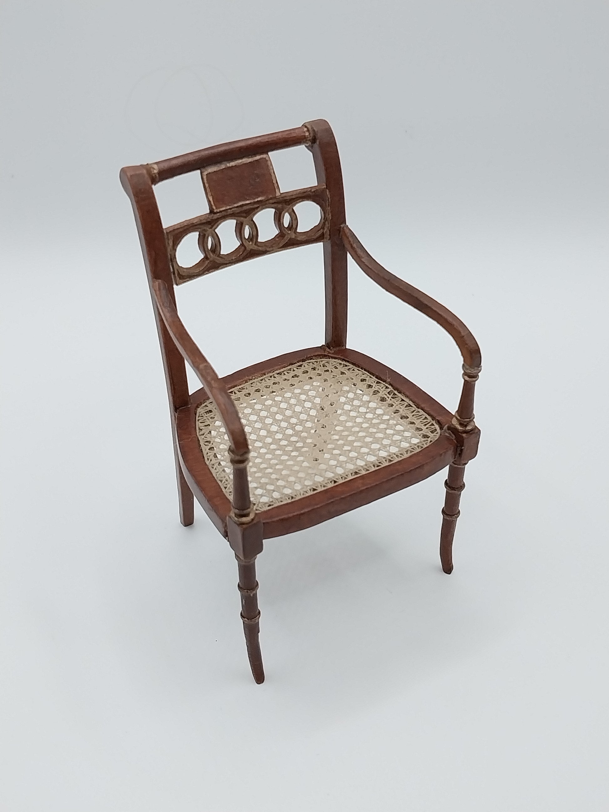 This Empire Ring Chair is made by Bespaq and comes in a Walnut finish with gold accents. This Chair has real cane seat and comes with cream beige chair pad. Chair is aged and used, this piece was Originally $58.99 NOW ONLY $39.99