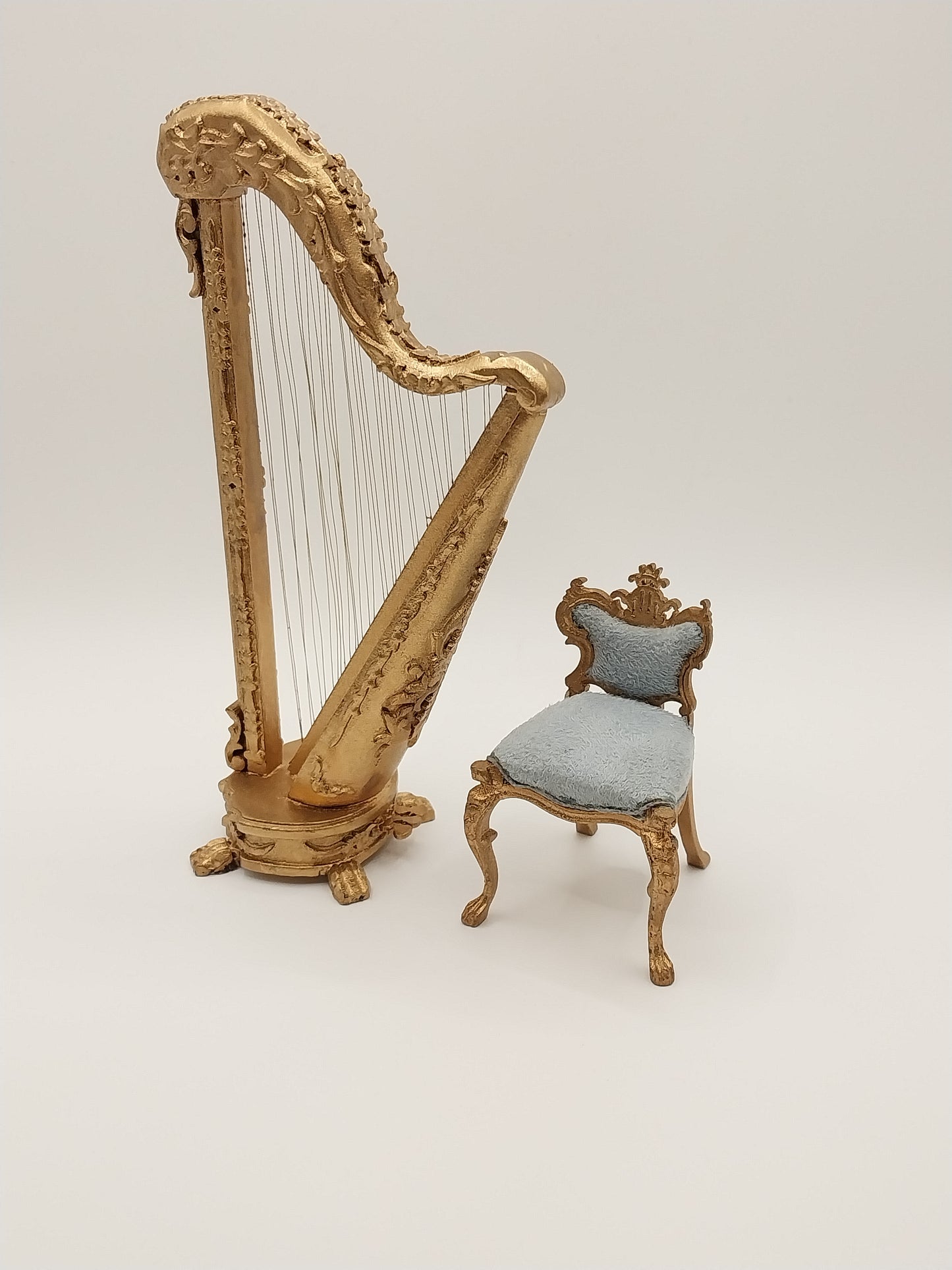 This Fantasy Lyre Harp and Chair is made by Bespaq and comes in a Gold finish. Lyre Harp has intricate carved embossed wood as well as the chair. Chair has a light blue suede fabric.