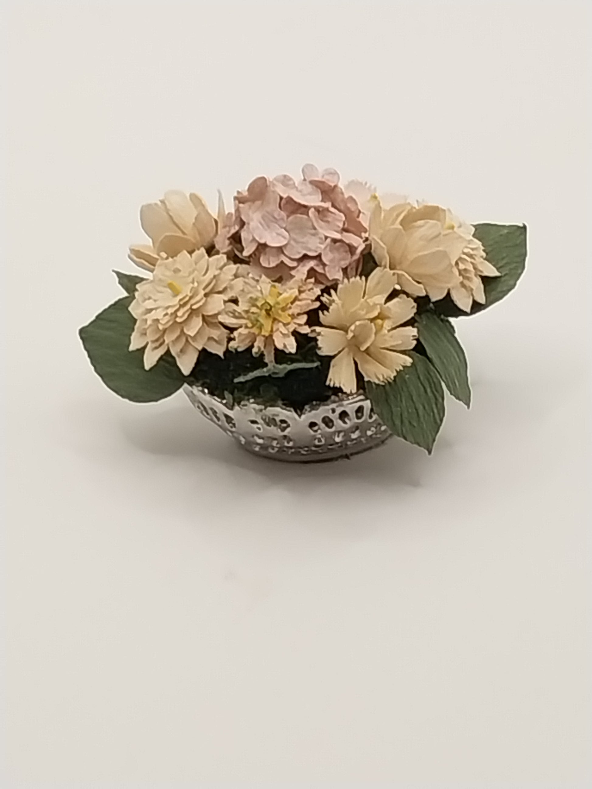 This Floral Arrangement is handmade by Artisan Paula Gilhooley. Arrangement is in a silver decorative bowl and has pale pink and cream Hydrangea, Magnolia, and Daisy Flowers.