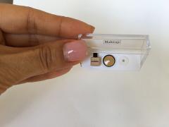 Items can removed from clear plastic display box and arranged on table, tray, etc. Foundation bottle is 1/4 x 1/4 X 3/8 inch (6 X 6 x 10 mm). Pressed powder compact 3/8 inch diameter (9 mm). Velvet pressed powder puff 5/16 inch diameter (8 mm).
