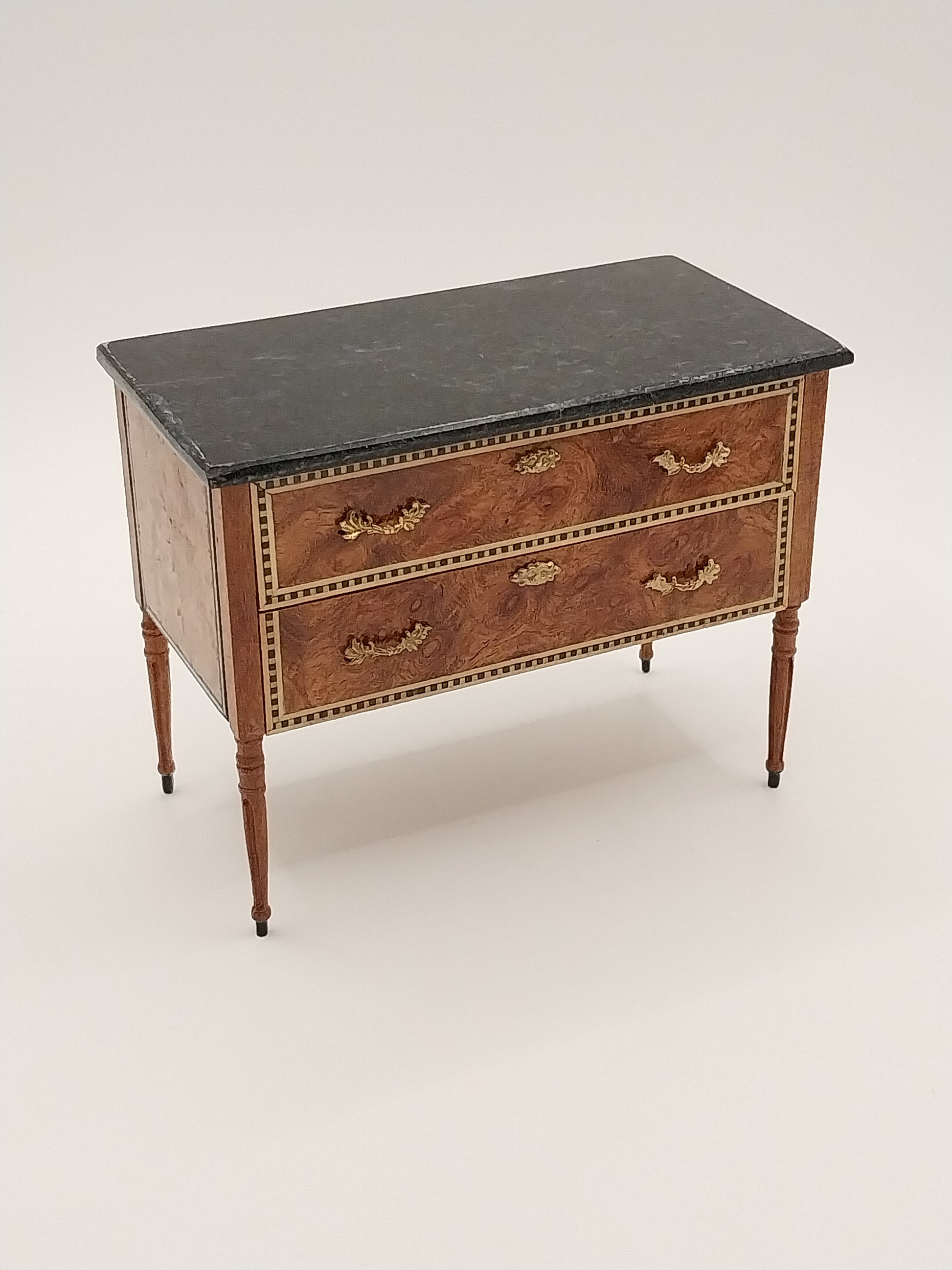 This Framed Chest has burled wood with inlaid dark trim on sides and has a dark green marble top. Chest is done by Artisan Tony Jones. Chest has 2 working drawers trimmed in gold with gold hardware. Piece is signed and dated 2019 by Artisan.