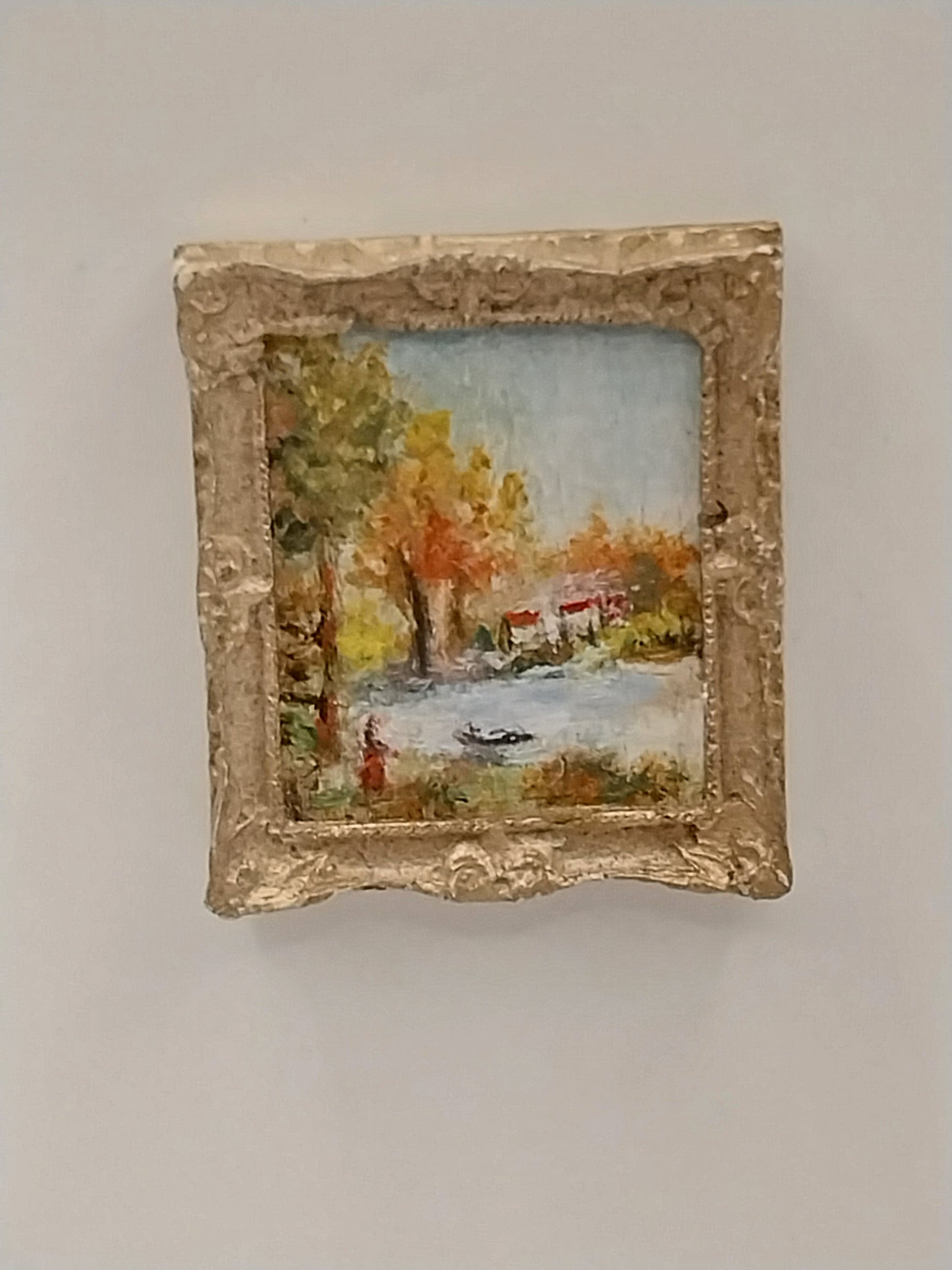 This Gold Framed Oil Painting is hand painted with oils by IGMA Artisan Josephine Meyer from Italy. Ornate gold frame with a Country Lake Scene. Piece is signed by Artisan.