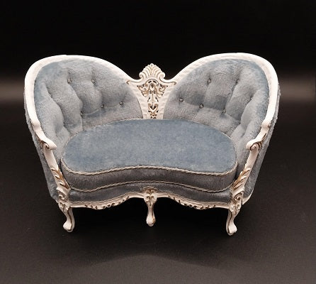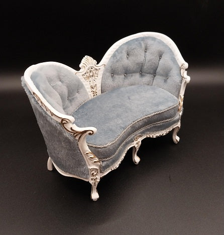 French Provincial Asymmetric shaped Chaise Lounge (Gossip settee) with Cabriole shaped legs. This style is sometimes referred to as a Gossip Settee with seating for 2 people provided by two Arm Chairs joined to form a single unit Available in painted white and gold finish upholstered in a soft blue fabric.