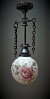 Gas Pendant, Pink Rose Globe. Works with a 12 Volt Electrical System and has replaceable bulbs