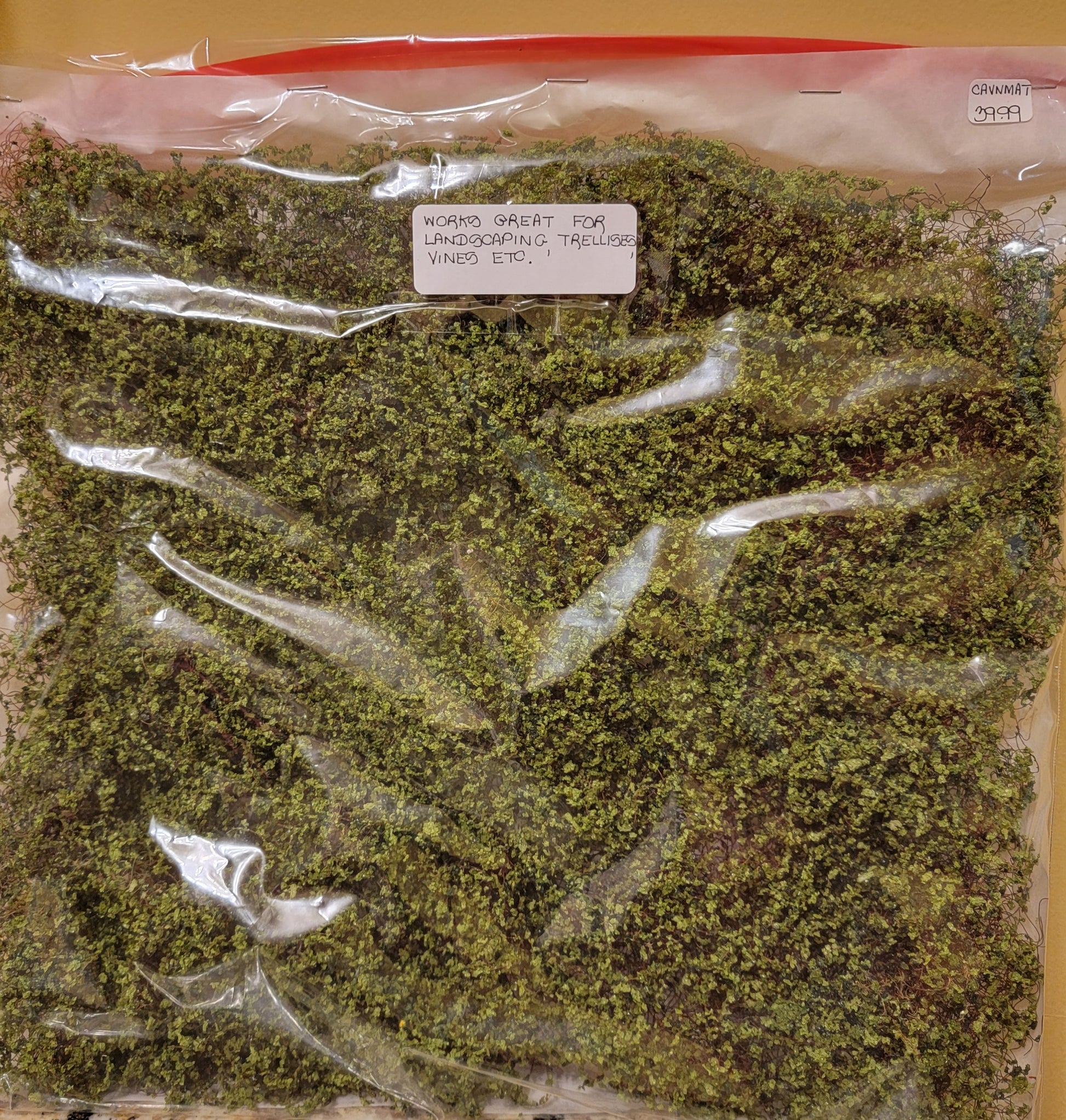 Green ivy vine mat that can be pulled apart and use for varies of dollhouse landscape project. It works great to place on the side of dollhouse for creeping ivy. Does well to make ivy trellis's or anytime of fencing or walls. Easy to cut and work with. Bill Lankford use this for all his building.