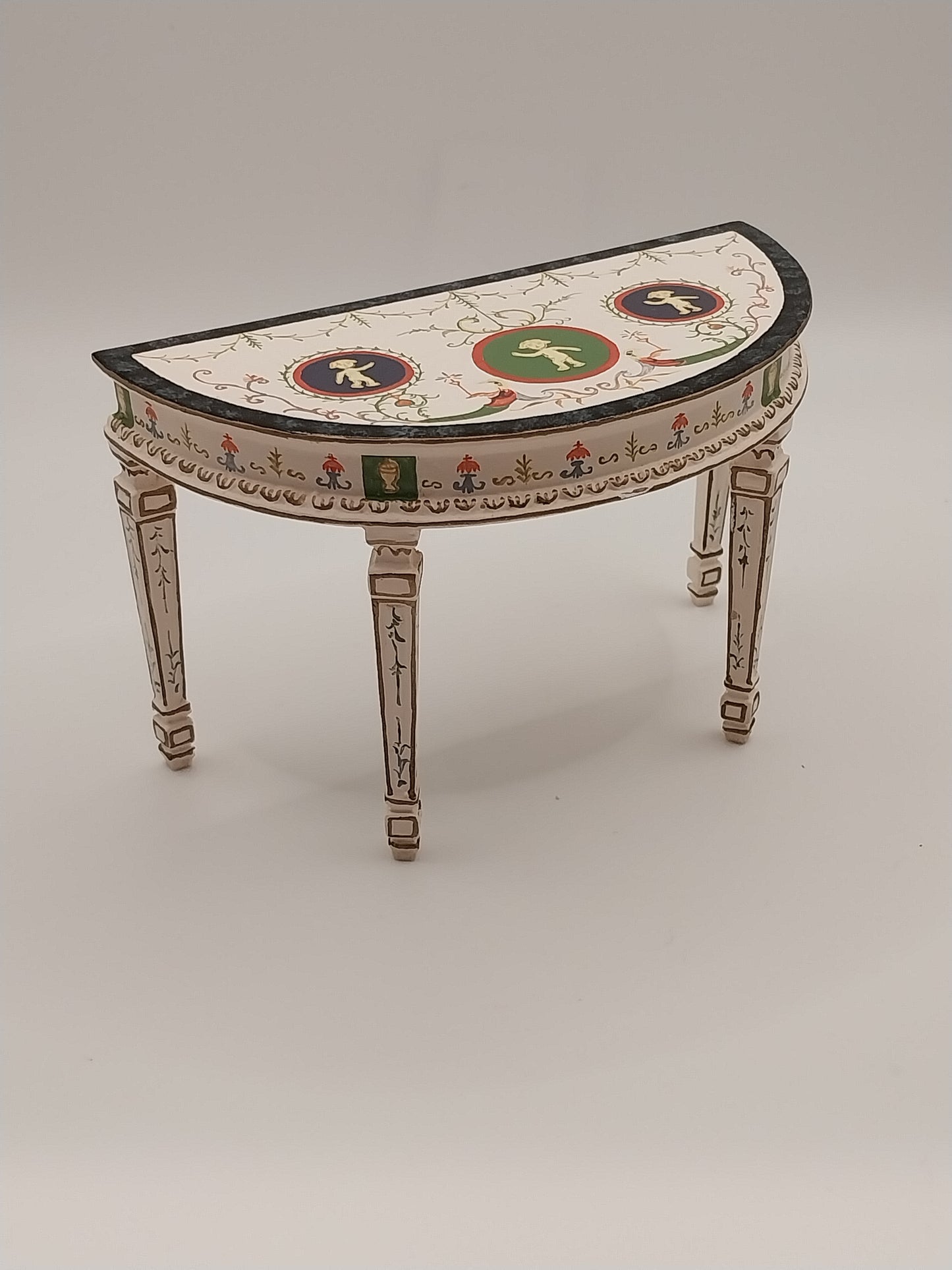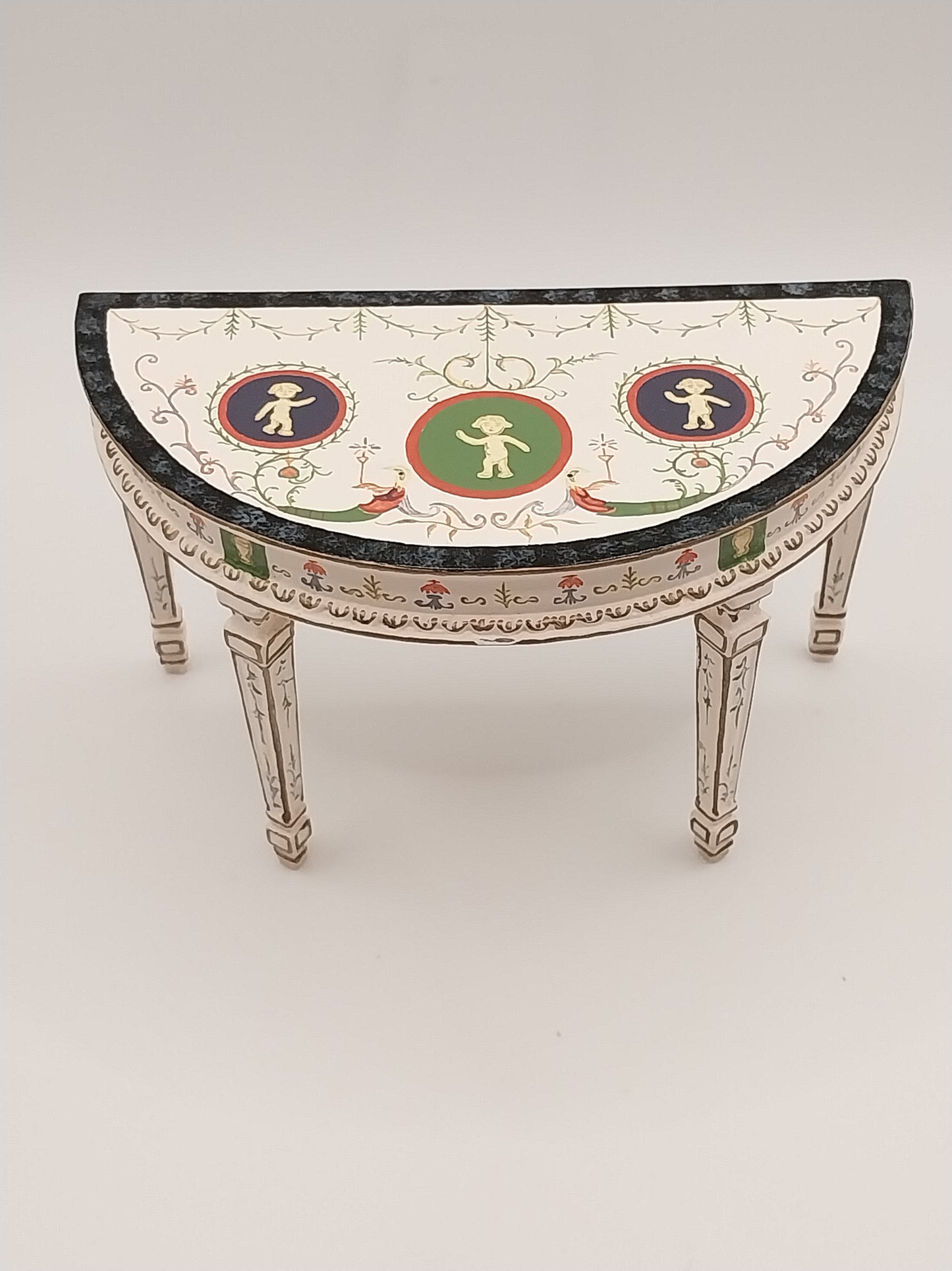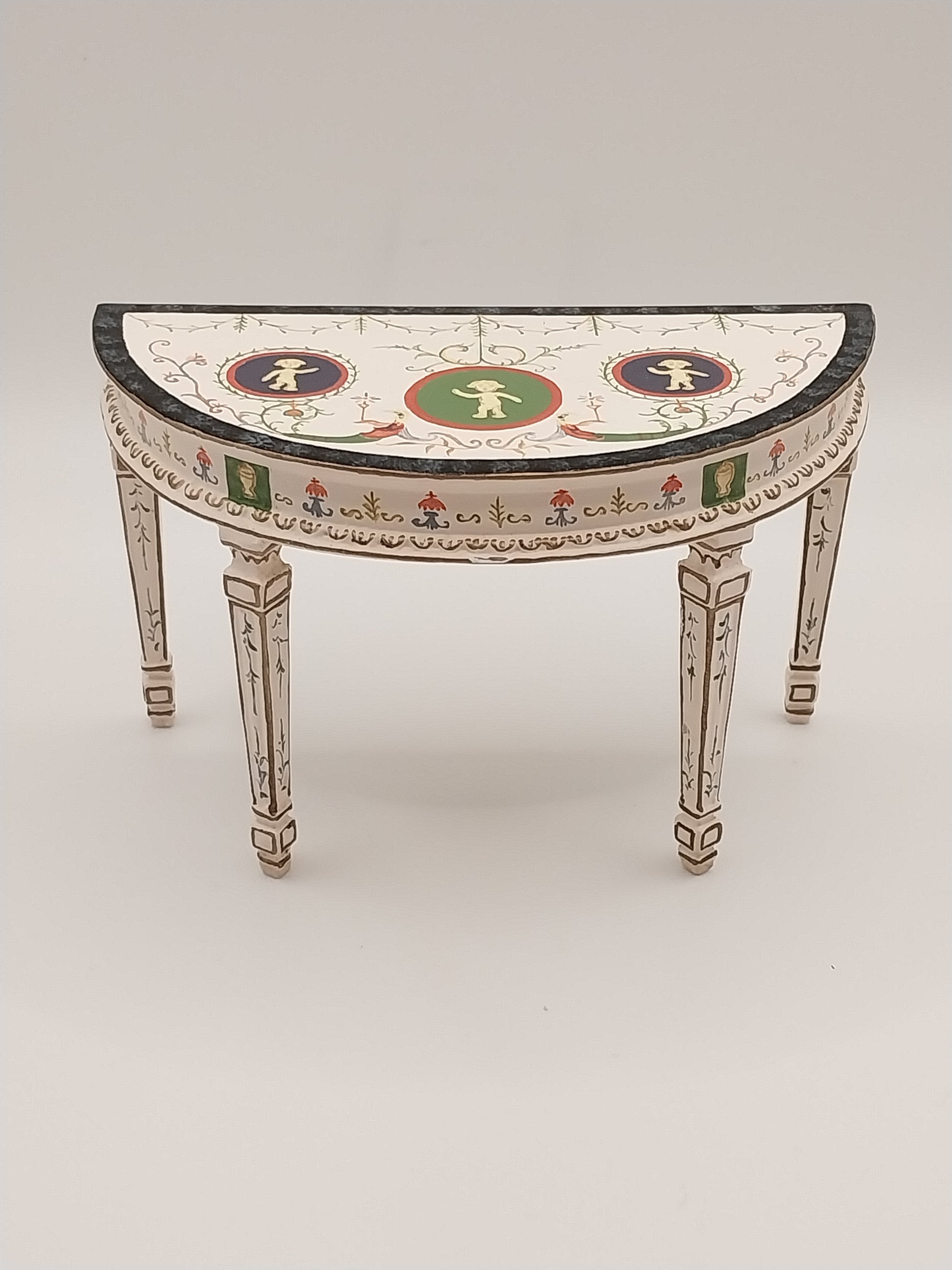 Hand painted Half Round Table. Table comes in a White finish with hand painted Cherub and decorative style in green, red, blue, and gold. Very Unique Piece.