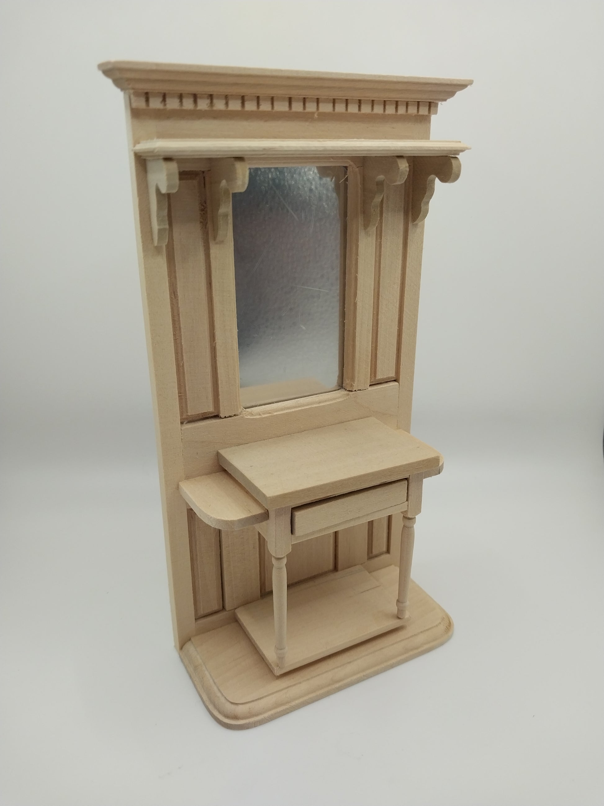This Hall Stand comes in Unfinished wood which can be stained or painted to match your room decor. Stand has upper mirror and comes with all hardware. Made in Spain.