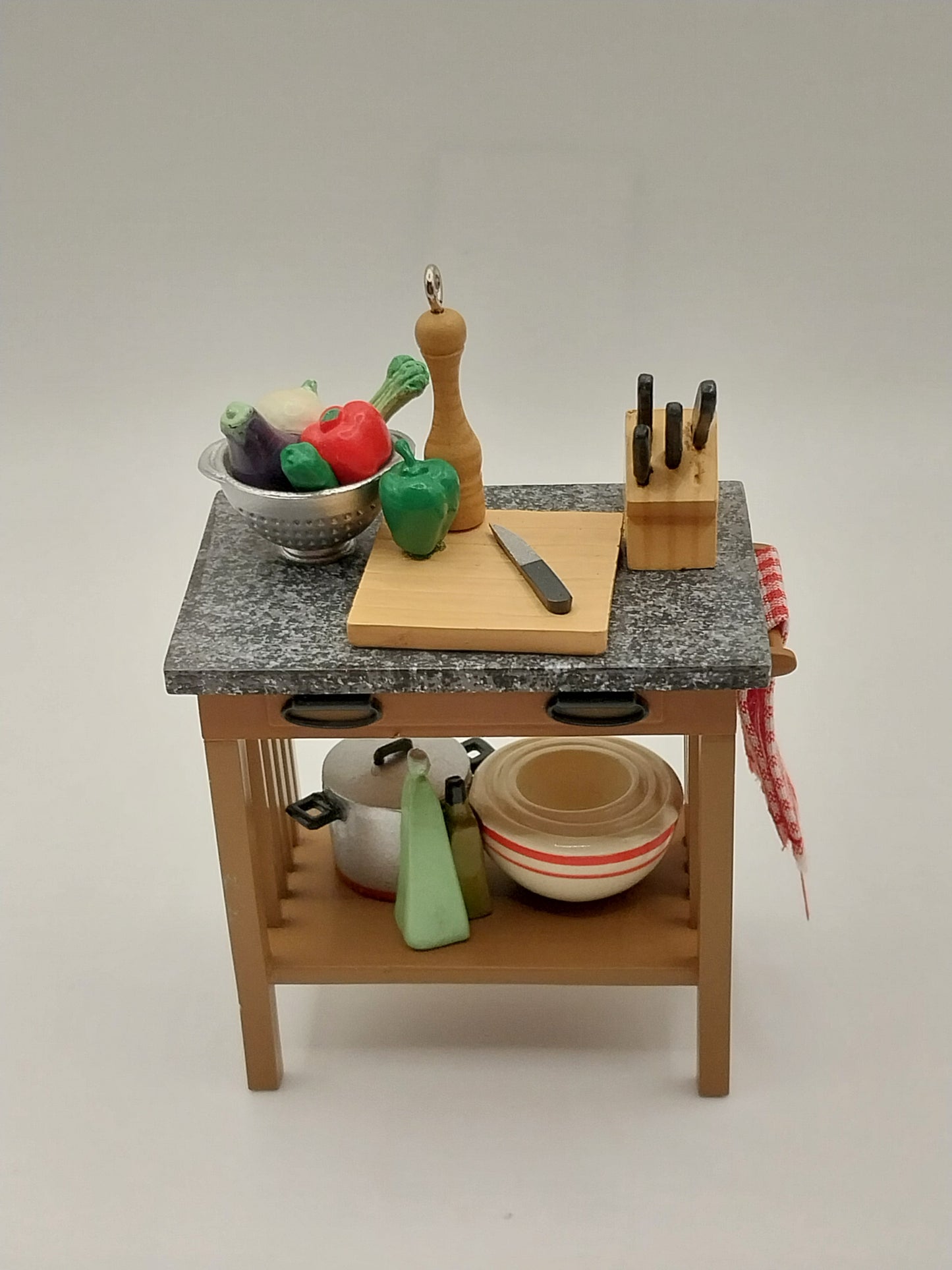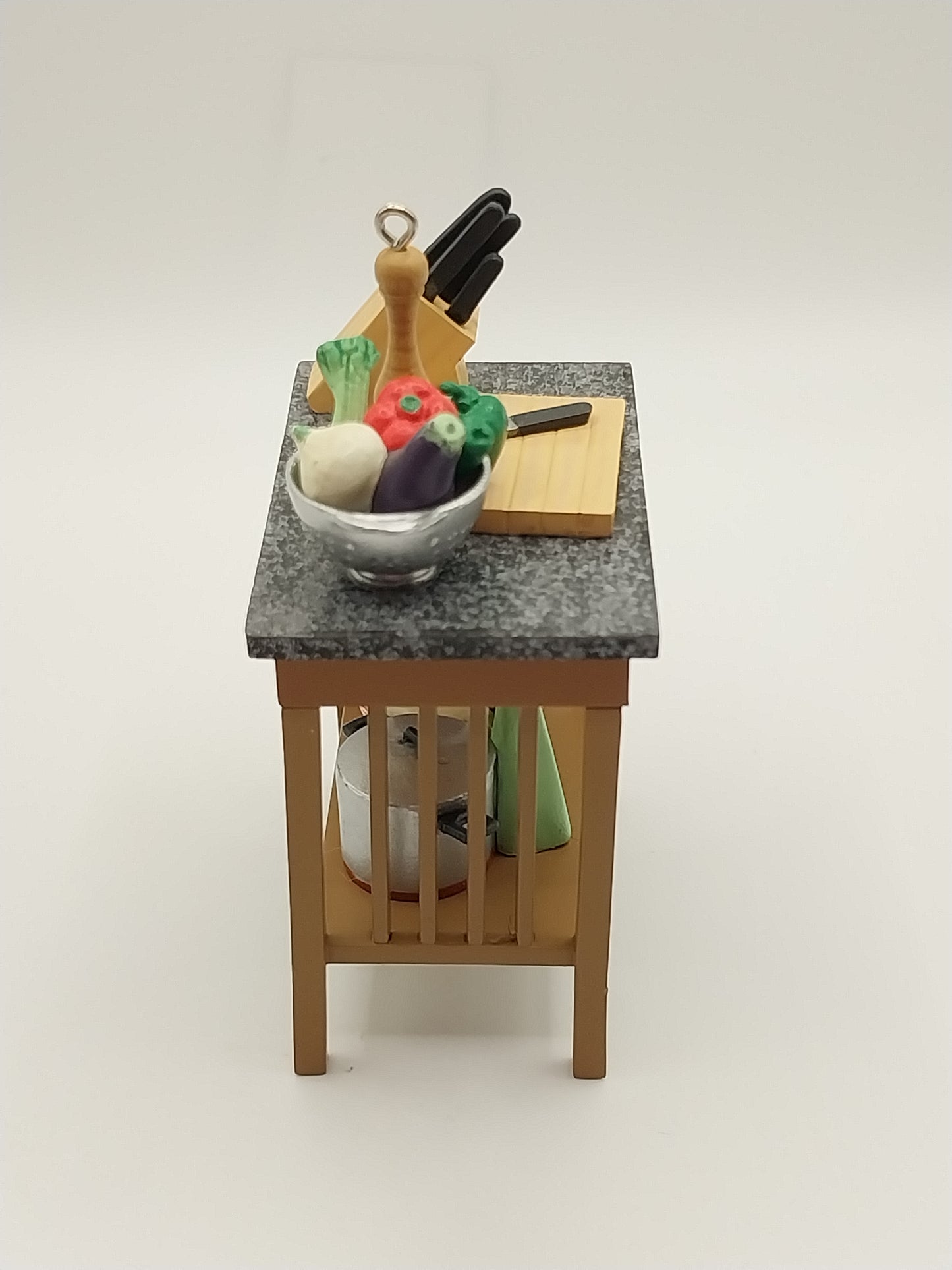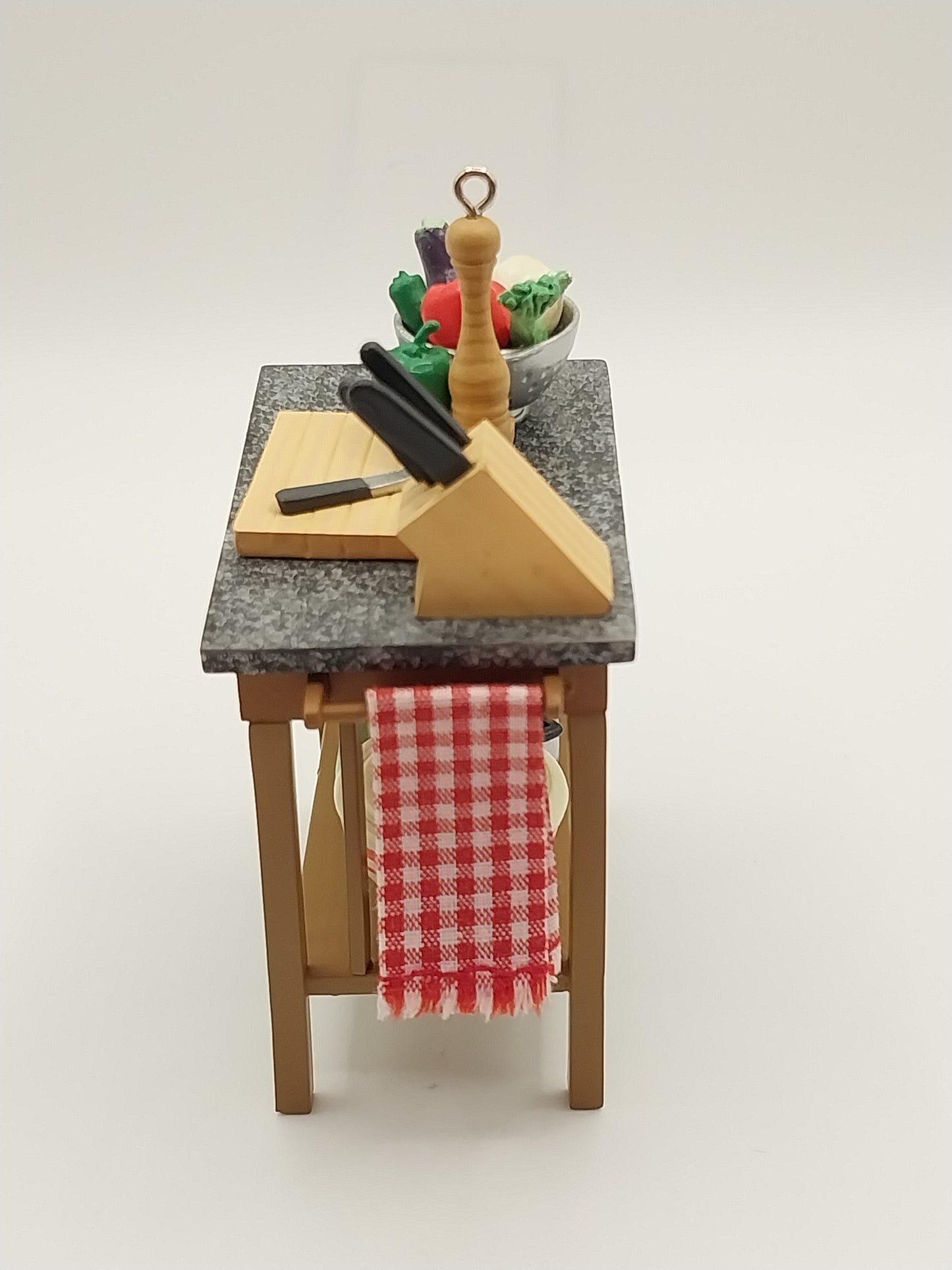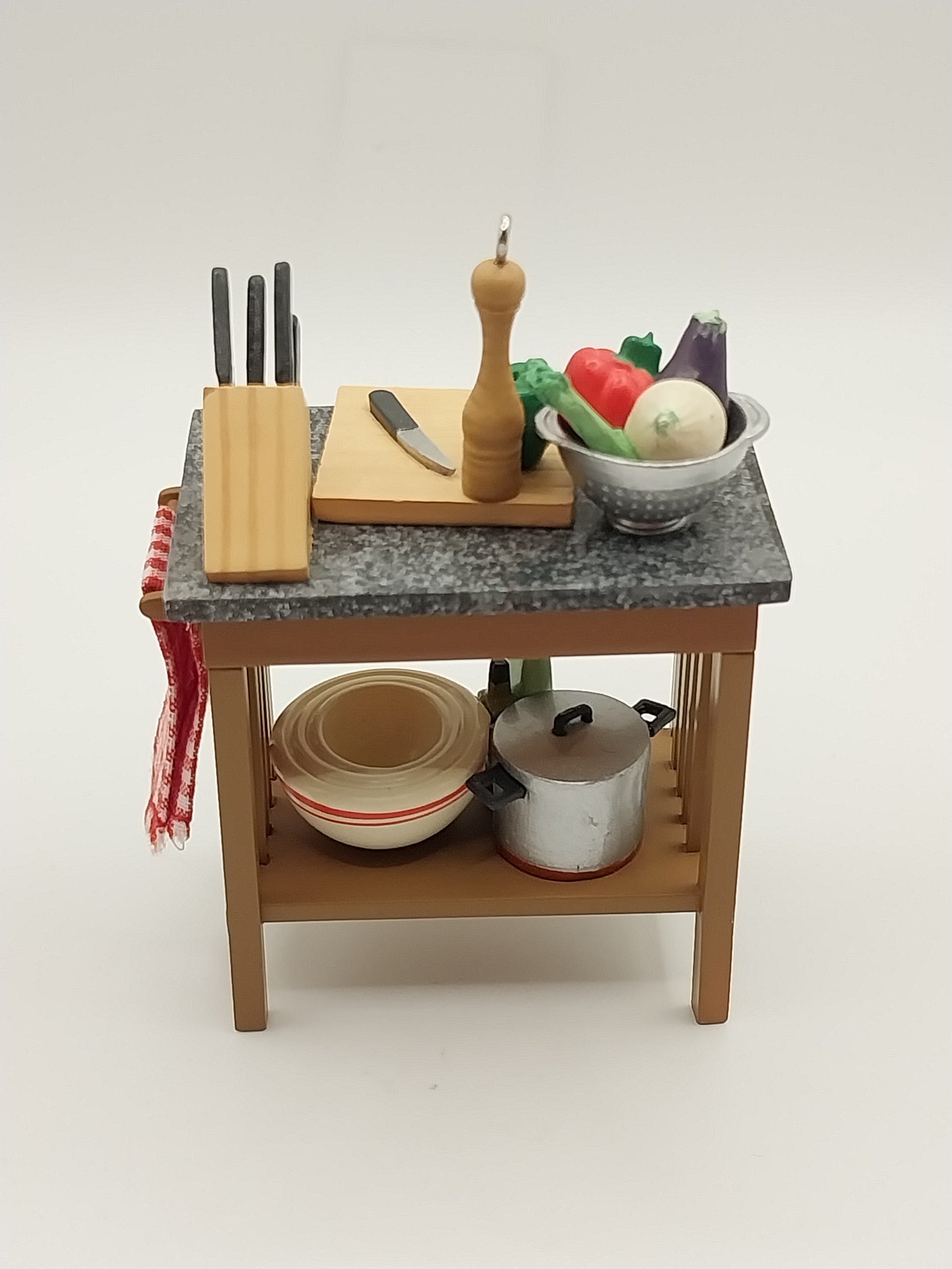 Do it Yourself A Flavor 2007 Hallmark Ornament, this piece is Rare and perfect for 1:12 Scale Kitchen. Table with colander full of fresh vegetables, cutting board, knife block with knives and underneath are bowls, pots and pans and Jars of ingredients. Red and white check towel hanging on the side.