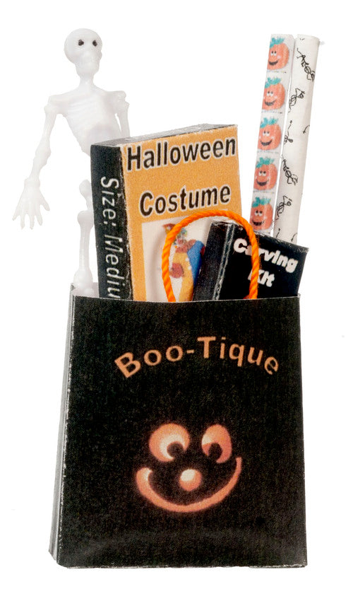 Halloween Shopping Bag filled with gift wrap, skeleton and Halloween treats