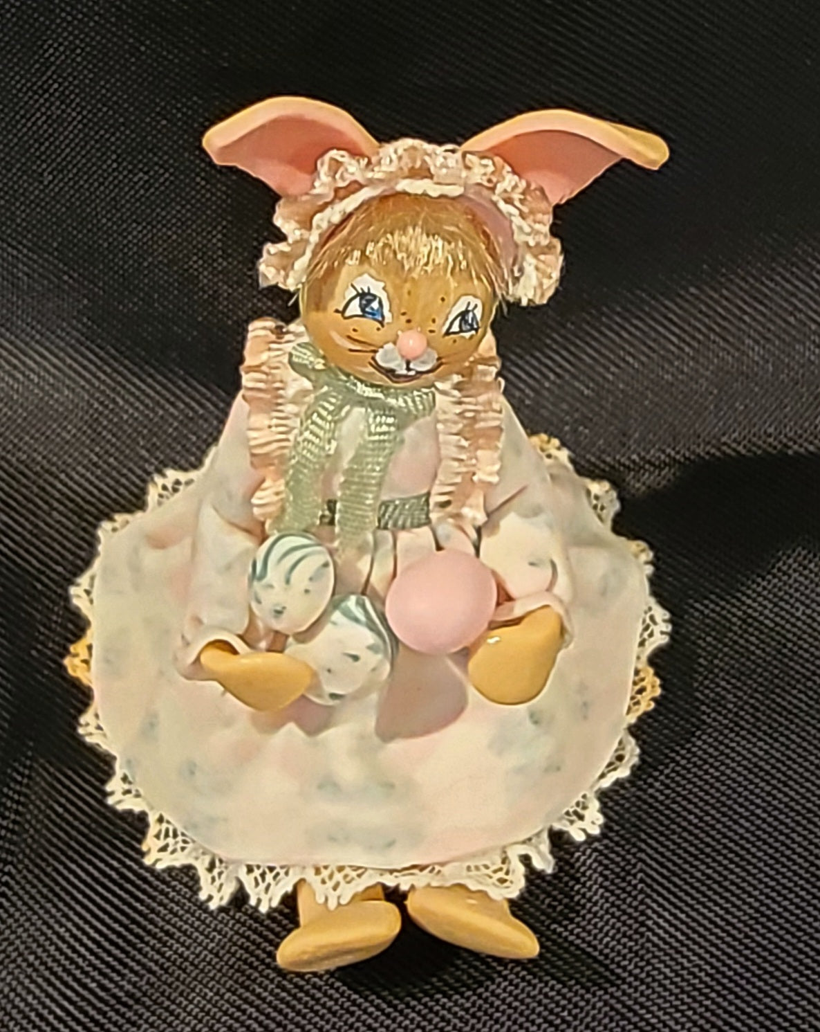 Hand sculpted with fimo clay figurine, Mrs. Rabbit holding eggs, by Artisan Arlette Evans. Beautifully hand painted face and great detail. Used but in great condition.