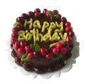 Round Chocolate Cake topped with cherries around sides and Happy Birthday written in yellow.