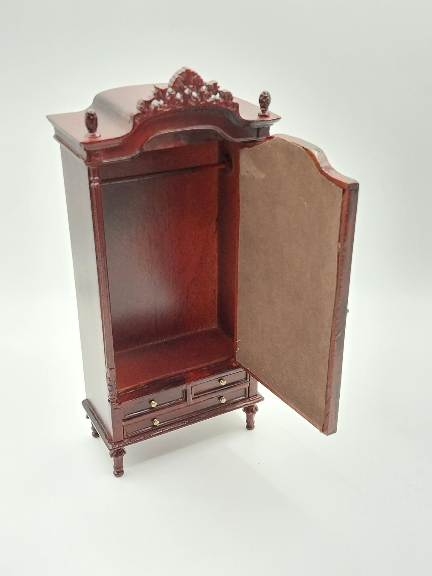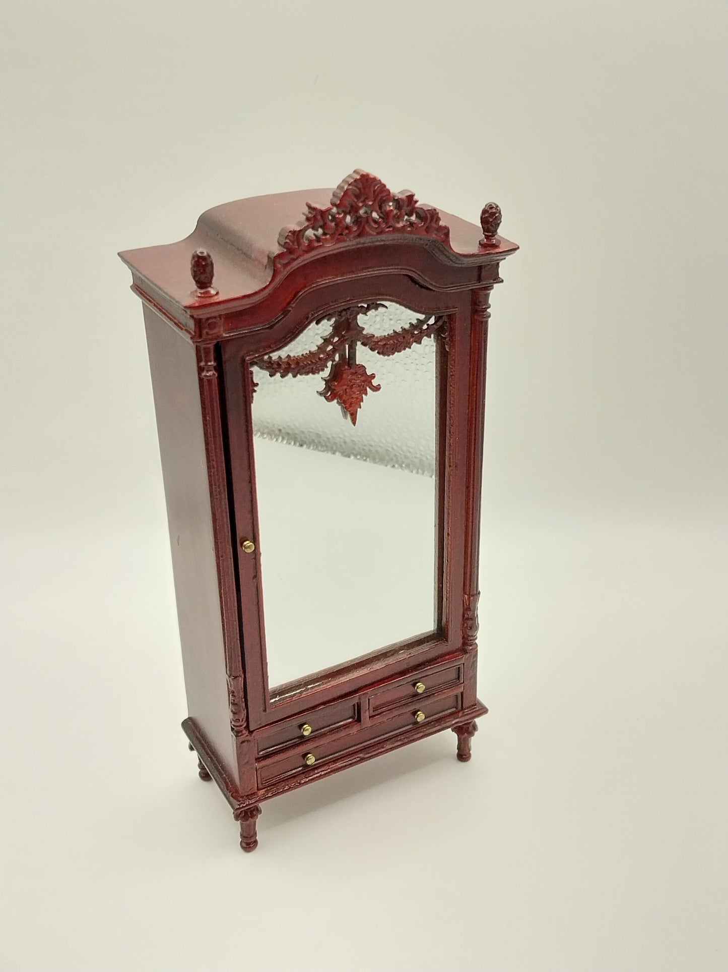 This Jeanne Swag Armoire is made by Bespaq and comes in a Mahogany finish. Armoire has mirrored door that opens up to closet space and has 3 lower drawers.