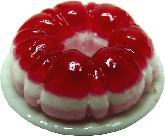 Perfectly Molded Jello in 3 layers of Red, White, & Pink Jello. Served on a white ceramic plate.