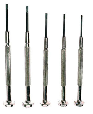 This set of five nickel-plated jeweler's screwdrivers is a must for installing or removing any small gauge screw. They have been designed with heads that swivel and blades that are permanently affixed to a knurled handle. Shaft blades range from widths of .049" to .079" with overall lengths between 3" and 3-3/8". Great small screwdriver set for crafts as well as glasses.