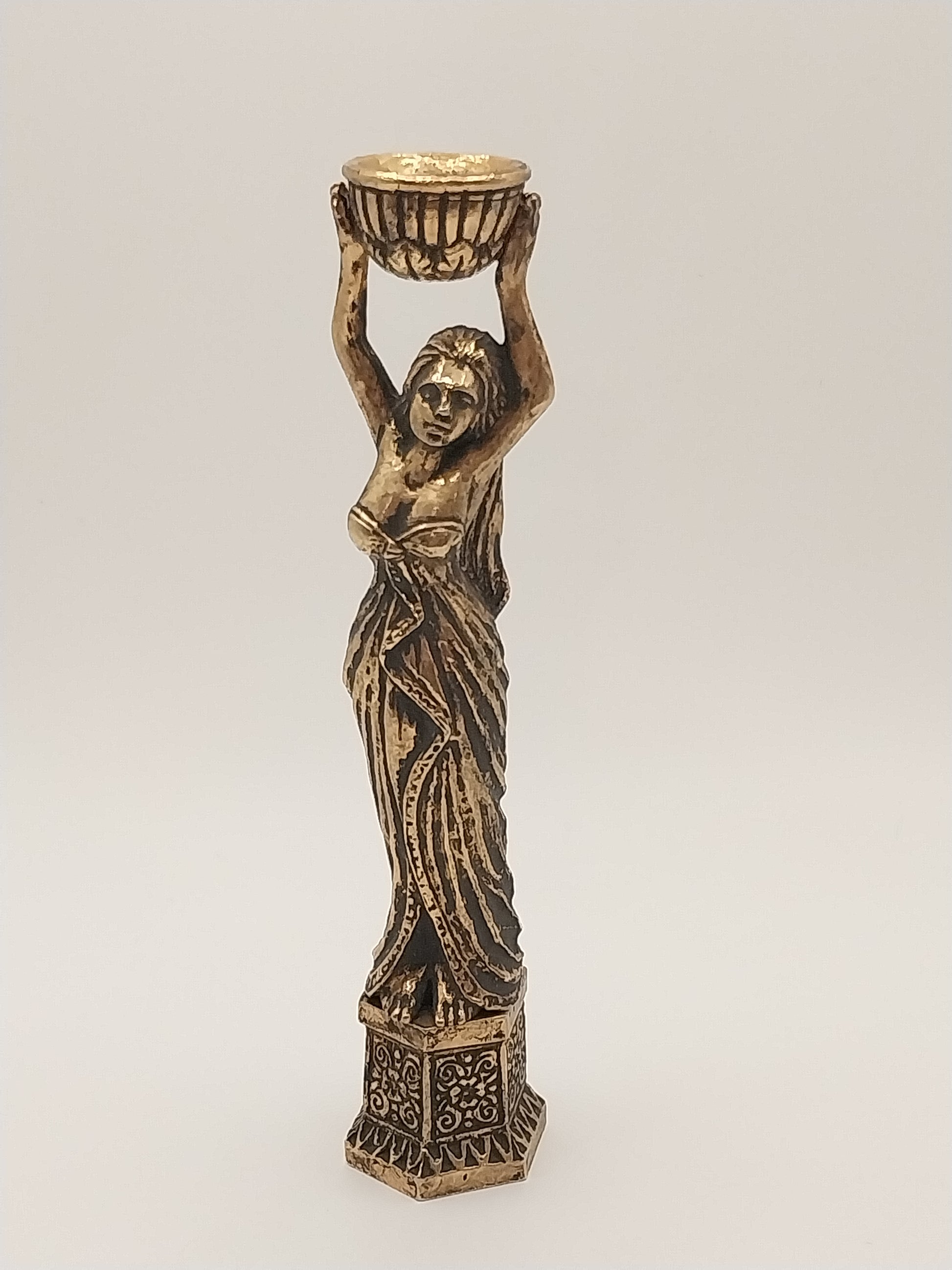 This Ornate Lady Pedestal comes in a Antique Gold and is of a lady in gown holding a bowl above her head by Jeanetta Kendall