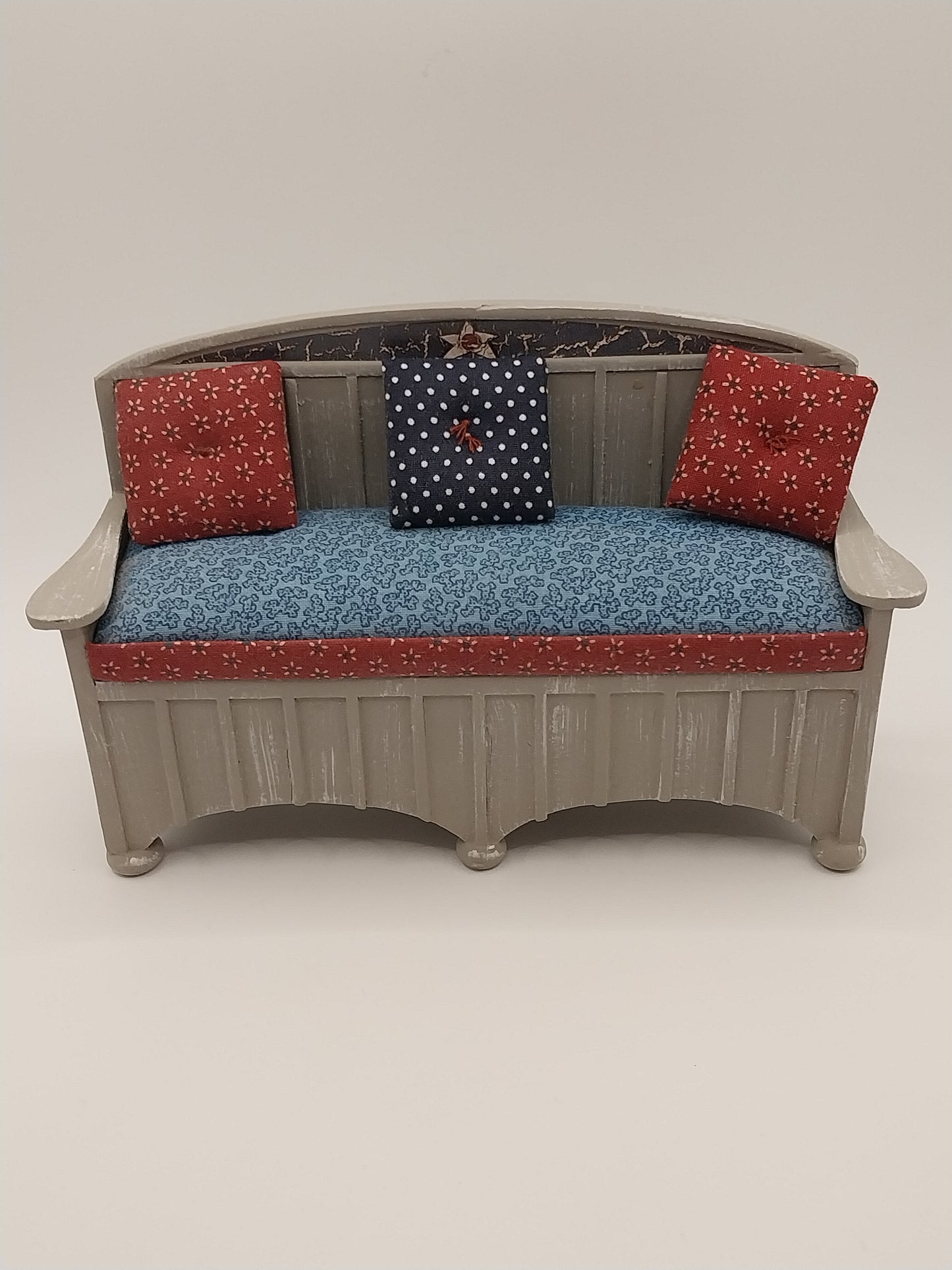 Liberty Bay Living Room Set designed in 1999 by Robin Betterley for Concord. Beautifully made and designed for that perfect nautical collection. Hand painted wood, faux in a weathered gray with a crackled Americana decal on the top. Cotton Americana Fabric and matching pillows included. The set includes 1 Settee, 2 chairs, 2 ottomans, and 7 pillows
