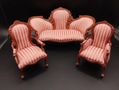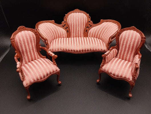 This Locust Hill Living Room Set is made by Bespaq and comes in a New Walnut finish. Set includes Sofa, Ladies Chair, and Gentleman's Chair. Each piece has a Rose Stripe Fabric.