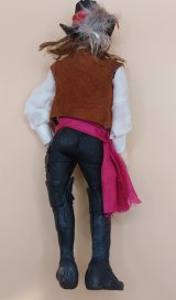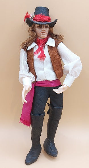 This Male Flamenco Dancer is Hand Sculpted by Artisan James Carrington. He is wearing black leather boots with black slacks, white shirt with brown vest and red scarf. He has long brown hair and is wearing a black hat with red feathers. He is ready for a partner to dance with. Doll has jointed armitures.