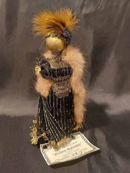 Golden Splendor Mannequin is dressed in black and gold gown with brown feathers and boa. Mannequin is LTD and number 34/50, done by Artisan Susan Franquist of Miniature Rose