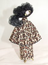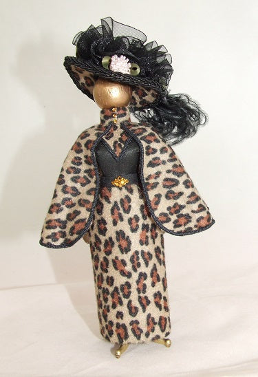 This Mannequin is made by Miniature Rose Artisan Susan Franquist and comes wearing a Leopard print skirt with brown top and a matching leopard print cape. Comes with a matching leopard print hat with black trim and a big black bow with feathers.