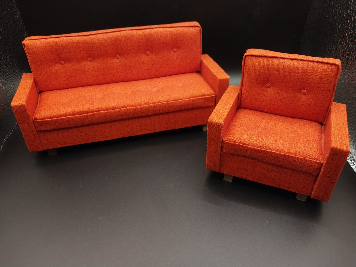 Bridge the old and new with this exciting mid century modern style living room furniture for your dollhouse! Set includes one sofa and one armchair done in Copper Color Fabric