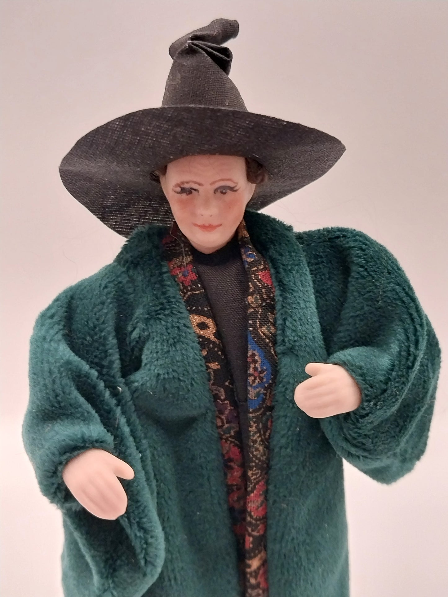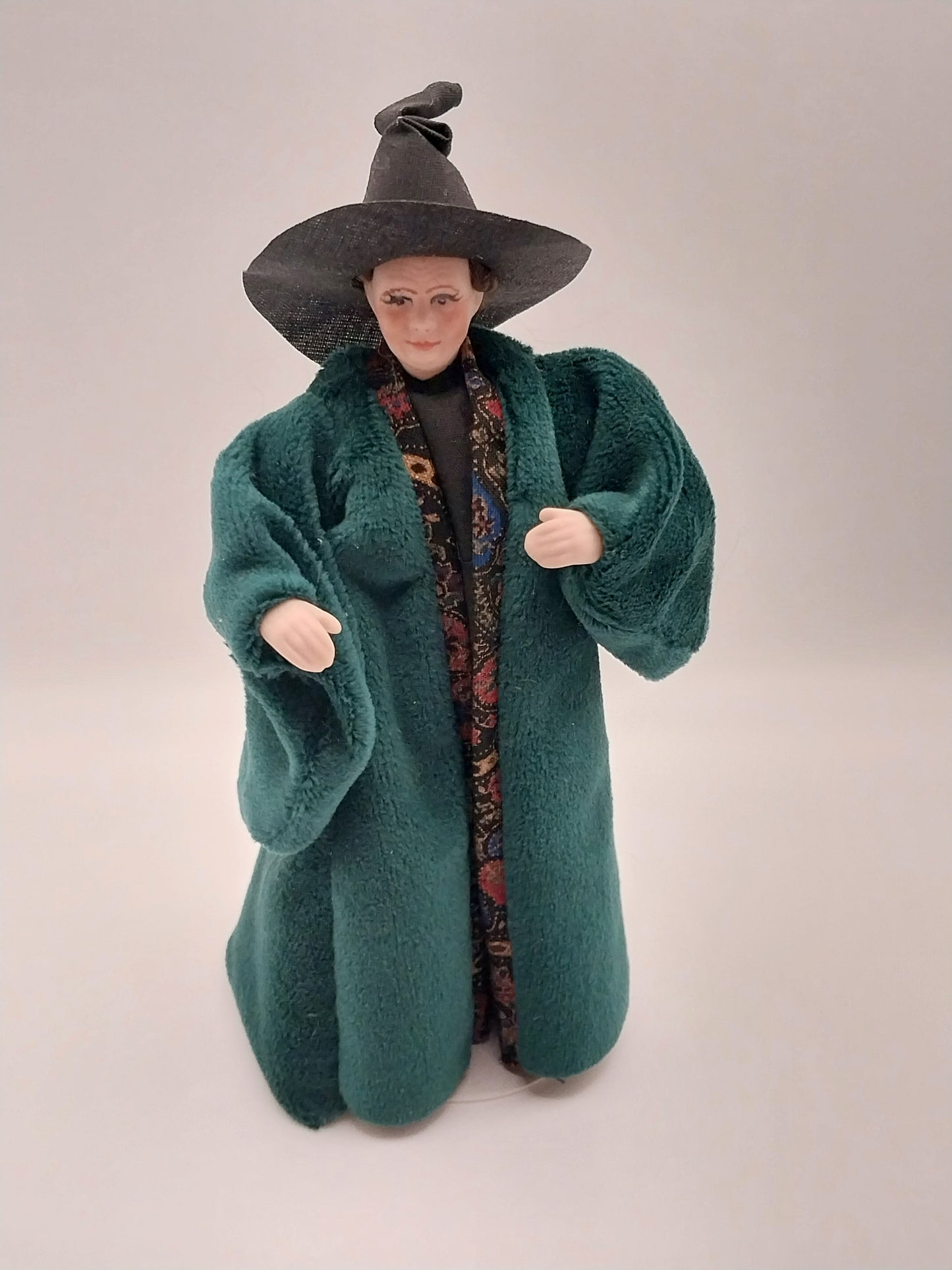 This Porcelain Doll is a replica of Mrs. McGonagall from Harry Potter. She is dressed in a Green velvet robe with an orange, green,& red scarf with a tall black witches hat. She has brown hair pulled back in a low bun. Doll Stand is Included