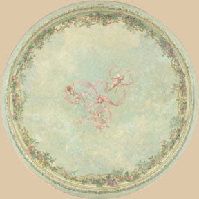 Ceiling Mural Wallpaper is Round with Tones of Blues and Greens with a Pink Ribbon and baby Angels in Center.