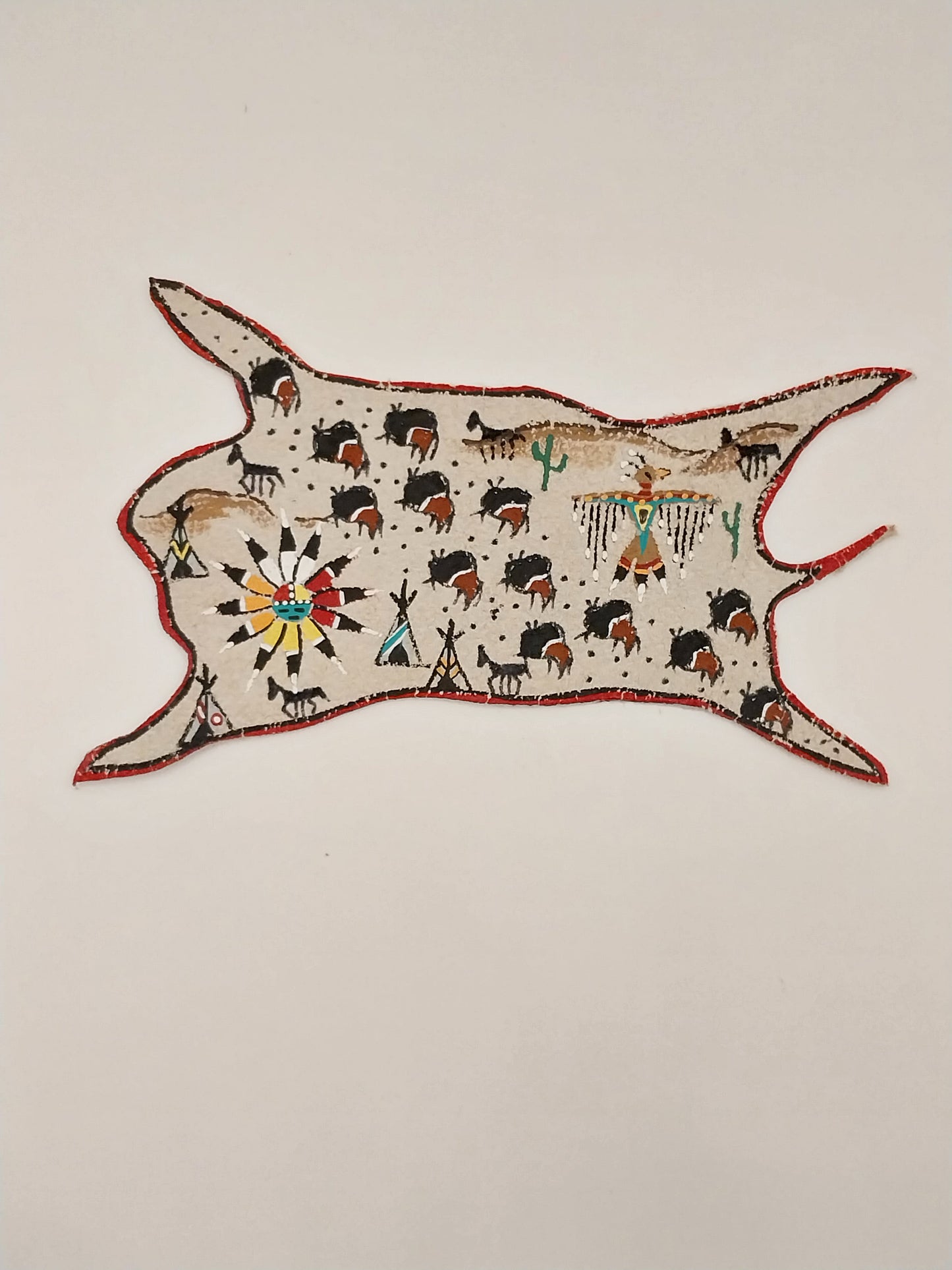 Vintage Native American Sal'e-Jo Sun Wall Hanging. This Piece is hand painted animal skin of Native American Sal'e-Jo Sun of the Osage Indians.