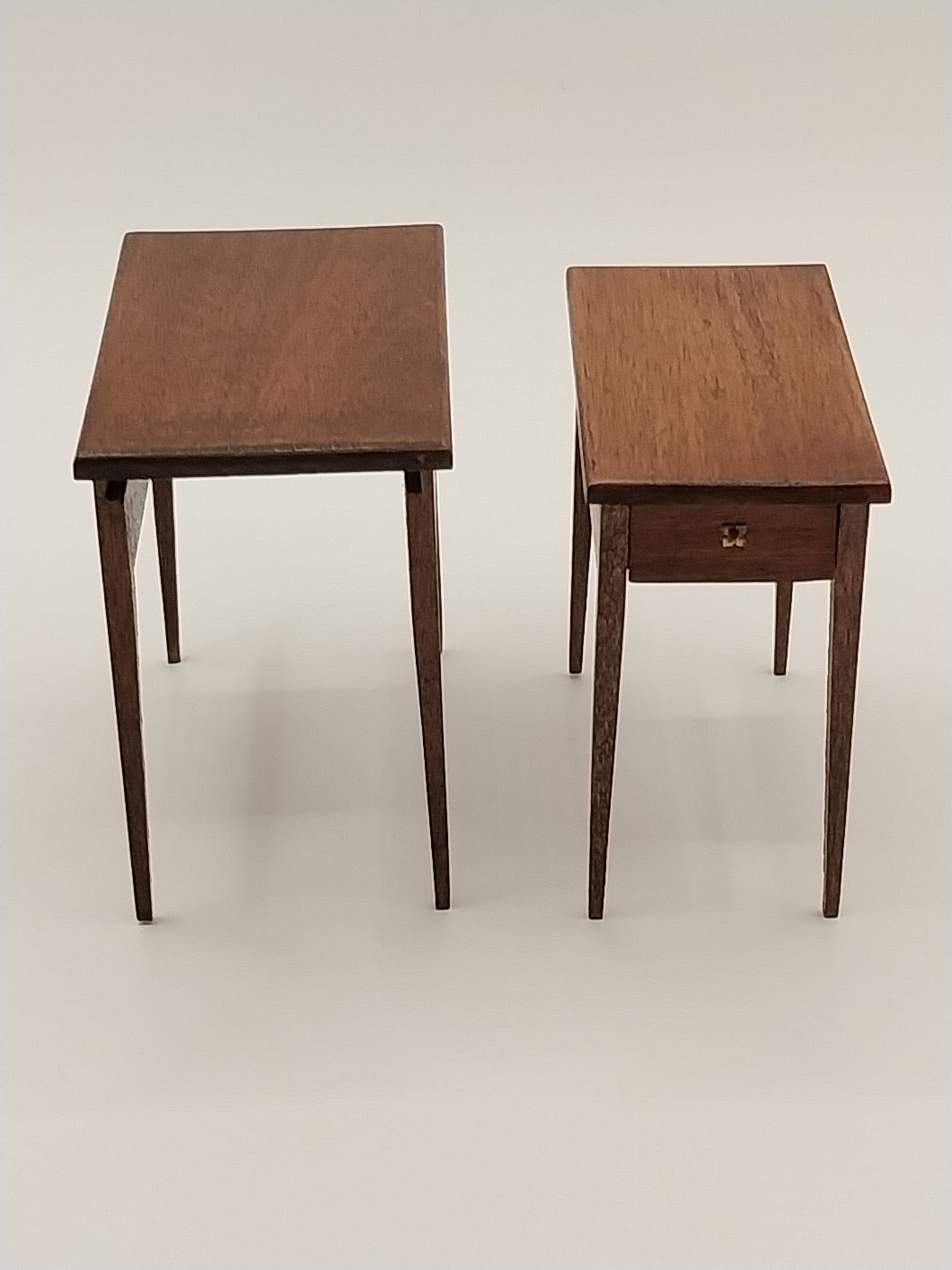 This set of 2 nesting tables are made by Artisan Anker & Carole Rasmussen and come in a Walnut finish. Smallest table has 1 working drawer. Piece is signed and dated 1996 by Artisan.